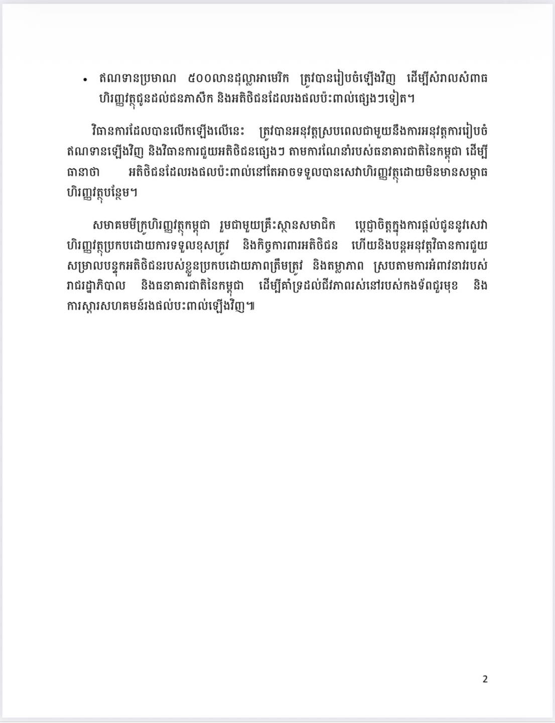 • ឥណទានប្រមាណ ៥០០លានដុល្លាអាមេរិក ត្រូវបានរៀបចំឡើងវិញ ដើម្បីសំរាលសំពាធហិរញ្ញវត្ថុជូនដល់ជនភាសឹក និងអតិថិជនដែលរងផលប៉ះពាល់ផ្សេងៗទៀត។