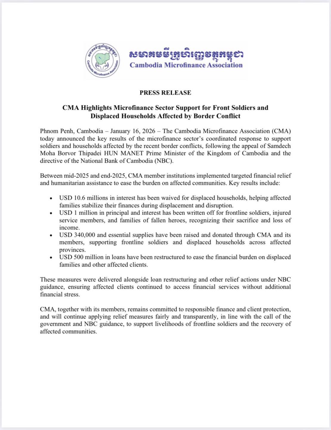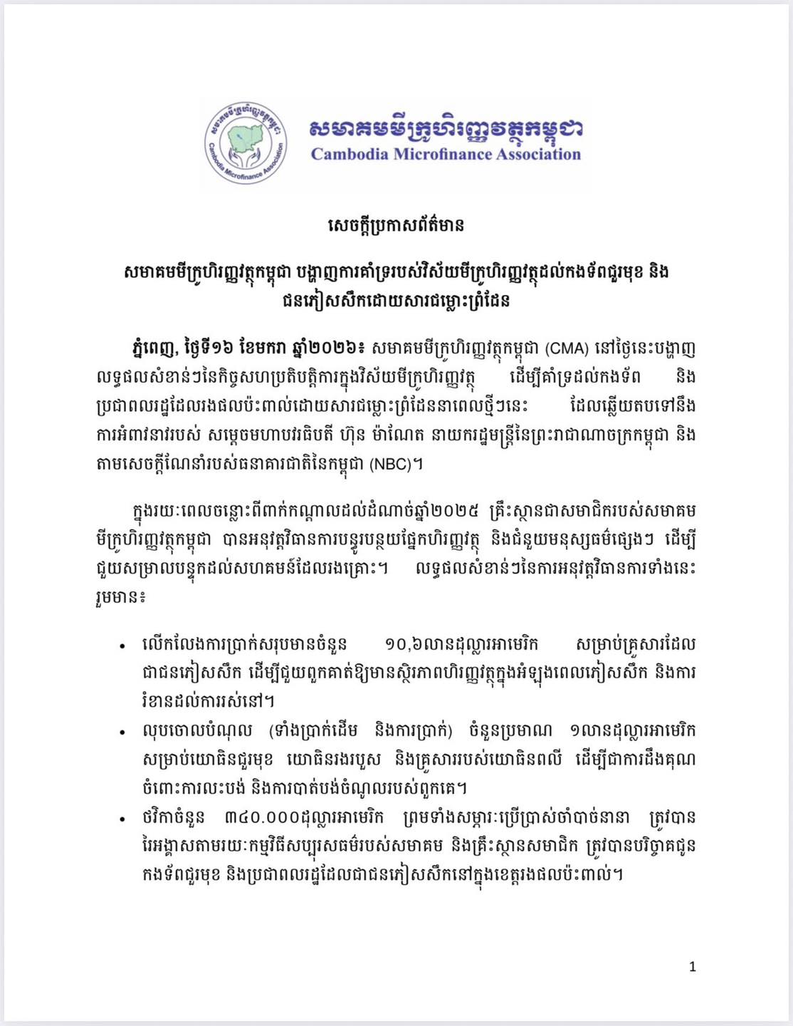នាថ្ងៃទីទី១៦ ខែមករា ឆ្នាំ២០២៦៖ សមាគមមីក្រូហិរញ្ញវត្ថុកម្ពុជា (CMA) បង្ហាញលទ្ធផលសំខាន់ៗនៃកិច្ចសហប្រតិបត្តិការក្នុងវិស័យមីក្រូហិរញ្ញវត្ថុ ដើម្បីគាំទ្រដល់កងទ័ព និងប្រជាពលរដ្ឋដែលរងផលប៉ះពាល់ដោយសារជម្លោះព្រំដែននាពេលថ្មីៗនេះ ដែលឆ្លើយតបទៅនឹងការអំពាវនាវរបស់ សម្តេចមហាបវរធិបតី ហ៊ុន ម៉ាណែត នាយករដ្ឋមន្រ្តីនៃព្រះរាជាណាចក្រកម្ពុជា និងតាមសេចក្តីណែនាំរបស់ធនាគារជាតិនៃកម្ពុជា (NBC)។