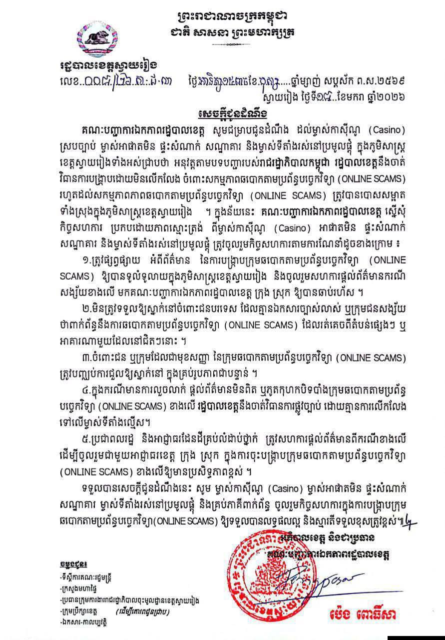 ខេត្តស្វាយរៀង​ ប្រកាសបោសសម្អាត​ ONLINE SCAMS​ ក្នុងភូមិសាស្ត្រខេត្តជាប់ព្រំដែននេះ​ ឱ្យអស់ទាំងស្រុង នេះបើយោងតាមសេចក្ដីជូនដំណឹងរបស់ រដ្ឋបាលខេត្តស្វាយរាង កាលពីថ្ងៃទី១៨ ខែមករា ឆ្នាំ២០២៦ ដែលត្រូវបានផ្សាយដោយ ឆាណែតេឡេក្រាម ឯកសារមន្រ្តីសាធារណៈ