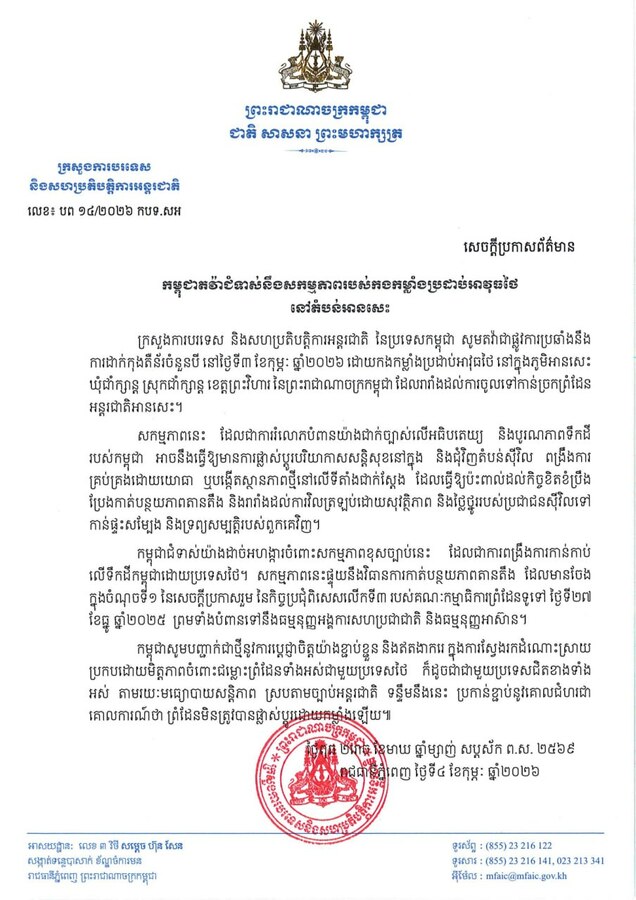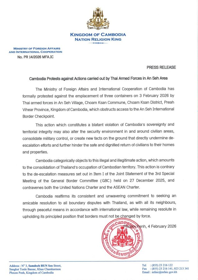 (រាជធានីភ្នំពេញ)៖ ក្រសួងការបរទេស និងសហប្រតិបត្តិការអន្តរជាតិ នៃព្រះរាជាណាចក្រកម្ពុជា នាព្រឹកថ្ងៃព្រហស្បតិ៍ ទី០៥ ខែកុម្ភៈ ឆ្នាំ២០២៦ បានចេញសេចក្ដីប្រកាសព័ត៌មាន តវ៉ាជាផ្លូវការប្រឆាំងនឹងការដាក់កុងតឺន័រចំនួនបី នៅថ្ងៃទី៣ ខែកុម្ភៈ ឆ្នាំ២០២៦ ដោយកងកម្លាំងប្រដាប់អាវុធថៃ នៅក្នុងភូមិអានសេះ ឃុំជាំក្សាន្ត ស្រុកជាំក្សាន្ត ខេត្តព្រះវិហារ នៃព្រះរាជាណាចក្រកម្ពុជា ដែលរារាំងដល់ការចូលទៅកាន់ច្រកព្រំដែន អន្តរជាតិអានសេះ។
