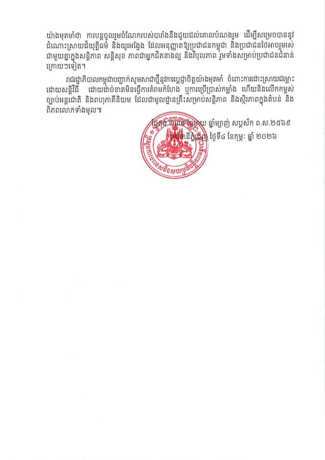 ក្រសួងការបរទេស និងសហប្រតិបត្តិការអន្តរជាតិ នៃព្រះរាជាណាចក្រកម្ពុជា បានឱ្យដឹងថា នៅថ្ងៃទី៤ ខែកុម្ភៈ ឆ្នាំ២០២៦ សម្តេចធិបតី ហ៊ុន ម៉ាណែត បានផ្ញើលិខិតមួយច្បាប់ ជូនឯកឧត្តម អេម៉ានុយអែល ម៉ាក្រុង ប្រធានាធិបតីនៃសាធារណរដ្ឋបារាំង ដើម្បីឆ្លើយតបទៅនឹងការបង្ហាញឆន្ទៈ របស់ប្រទេសបារាំង ក្នុងការត្រៀមខ្លួន ផ្តល់នូវឯកសារប្រវត្តិសាស្ត្រ និងបច្ចេកទេសពាក់ព័ន្ធនឹងព្រំដែនអន្តរជាតិ រវាងប្រទេសកម្ពុជា និងប្រទេសថៃ ក្នុងករណីមានសំណើ ពីប្រទេសកម្ពុជា។