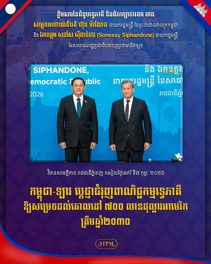 រាជធានីភ្នំពេញ៖ យោងតាមការចុះផ្សាយរបស់ ក្រសួងព័ត៌មាន នៅថ្ងៃទី៧ ខែកុម្ភៈ ឆ្នាំ២០២៦ បានឱ្យដឹងថា សម្តេចមហាបវរធិបតី ហ៊ុន ម៉ាណែត នាយករដ្ឋមន្រ្តី នៃព្រះរាជាណាចក្រកម្ពុជា បានទទួលជួបពិភាក្សាការងារជាមួយ ឯកឧត្តម សនសៃ ស៊ីផាន់ដន (Sonexay Siphandone) នាយករដ្ឋមន្រ្តីនៃសាធារណរដ្ឋប្រជាធិបតេយ្យប្រជាមានិតឡាវ នៅវិមានសាមគ្គីភាព ក្នុងឱកាសដែលឯកឧត្តមនាយករដ្ឋមន្ត្រីឡាវអញ្ជើញចូលរួមកិច្ចប្រជុំរវាងថ្នាក់ដឹកនាំកំពូលគណបក្សប្រជាជនកម្ពុជា, ថ្នាក់ដឹកនាំកំពូលគណបក្សកុម្មុយនីស្តវៀតណាម និងថ្នាក់ដឹកនាំកំពូលគណបក្សប្រជាជនបដិវត្តន៍ឡាវ នៅរាជធានីភ្នំពេញ ព្រះរាជាណាចក្រកម្ពុជា ពីថ្ងៃទី៦ដល់ថ្ងៃទី៧ ខែកុម្ភៈ ឆ្នាំ២០២៦។
