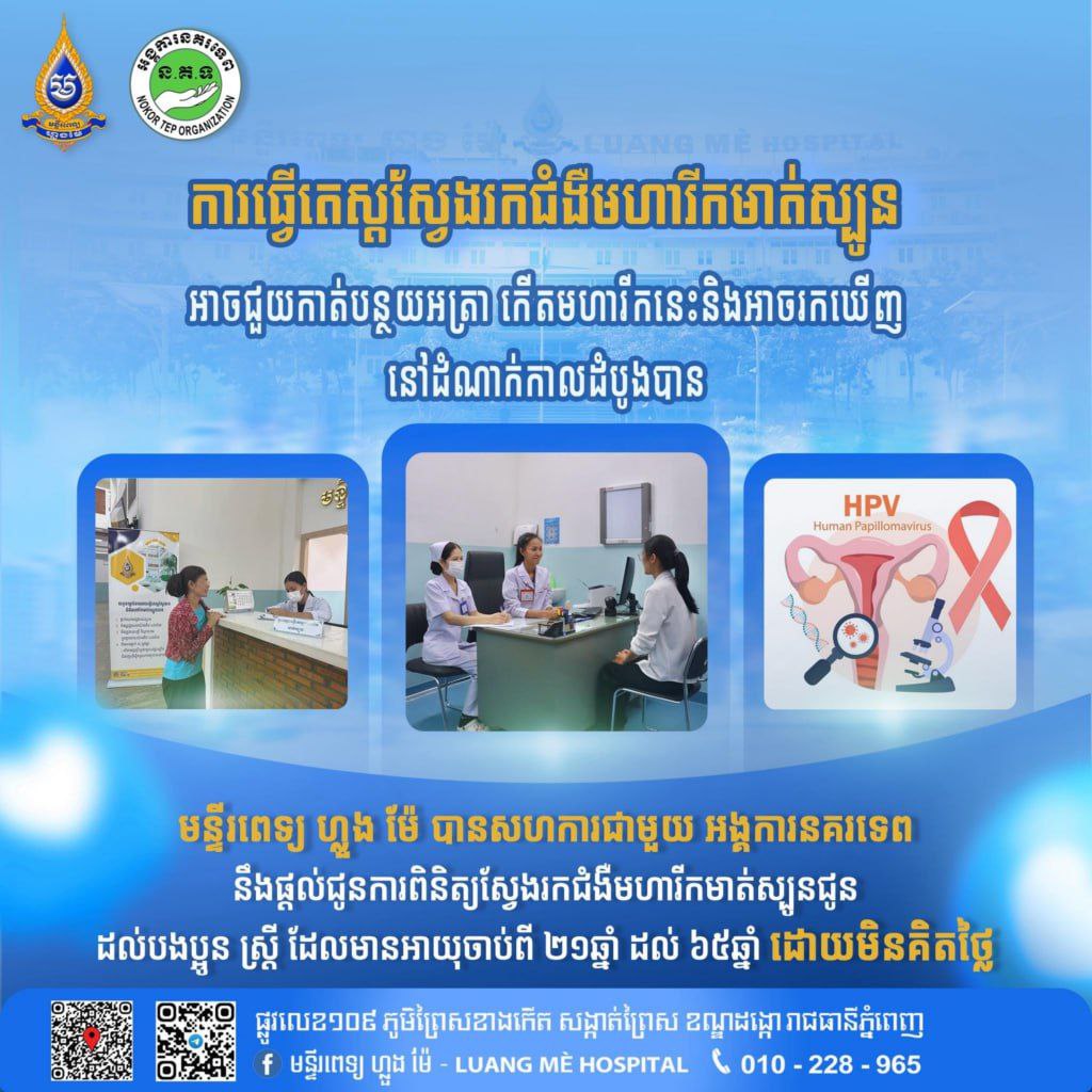 មន្ទីរពេទ្យហ្លួងម៉ែ ប្រកាសផ្តល់ជូនការពិនិត្យស្វែងរកជំងឺមហារីកមួយប្រភេទនេះដល់ស្ត្រី ដោយឥតគិតថ្លៃរៀងរាល់ថ្ងៃ