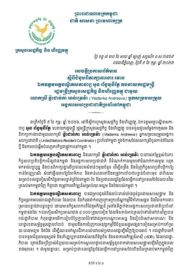 យោងតាមការចុះផ្សាយរបស់ ក្រសួងព័ត៌មាន បានឱ្យដឹងថា នាព្រឹកថ្ងៃទី ៩ ខែ កុម្ភៈ ឆ្នាំ ២០២៦, នៅទីស្ដីការក្រសួងសេដ្ឋកិច្ច និងហិរញ្ញវត្ថុ, ឯកឧត្តមអគ្គបណ្ឌិតសភា-ចារ្យ អូន ព័ន្ធមុនីរ័ត្ន ឧបនាយករដ្ឋមន្រ្តី រដ្ឋមន្រ្តីក្រសួងសេដ្ឋកិច្ច និងហិរញ្ញវត្ថុ បានទទួលជួបសម្ដែងការគួរសម និងពិភាក្សាការងារជាមួយលោកស្រី វ្ល៉ាដាន់កា អាន់ឌ្រេវ៉ា (Vladanka Andreeva)អ្នកសម្របសម្រួលអង្គការសហប្រជាជាតិ (United Nations Resident Coordinator) ប្រចាំនៅកម្ពុជា ក្នុងឱកាសដែលលោកស្រីចូលកាន់តំណែងថ្មី និងការចាប់ផ្តើមបំពេញភារកិច្ចជាផ្លូវការនៅកម្ពុជា។