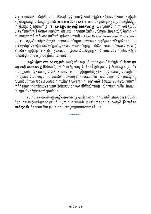 ឯកឧត្តមអគ្គបណ្ឌិតសភាចារ្យ បានជម្រាបជូនអំពីផលប៉ះពាល់យ៉ាងធ្ងន់ធ្ងរដោយសារសង្រ្គាម និងកិច្ចអន្តរាគមរបស់រាជរដ្ឋាភិបាល ដែលបាន និងកំពុងដាក់ចេញក្រោមក្របខ័ណ្ឌកម្មវិធីគាំពារសង្គម និងវិធានការដោះស្រាយបន្ទាន់ជាបន្តបន្ទាប់ ដោយមានកិច្ចសហការពីដៃគូអភិវឌ្ឍន៍ រួមទាំងទីភ្នាក់ងារអង្គការសហប្រជាជាតិប្រចាំនៅកម្ពុជាផងដែរ ។ ជនភៀសសឹកប្រមាណជាង ៤ ០០០ គ្រួសារទៀត ដែលមិនទាន់អាចត្រលប់ទៅលំនៅឋានវិញបាន រាជរដ្ឋាភិបាល កំពុងផ្តោតលើការរៀបចំប្រែក្លាយជំរំទៅជាជម្រកបណ្តោះអាសន្ន និងរៀបចំសេវាសាធារណៈ និងហេដ្ឋារចនាសម្ព័ន្ធមូលដ្ឋានចាំបាច់ ជាមួយនឹងការជំរុញការអនុវត្តកម្មវិធីជំនួយសង្គមផ្សេងៗទៀតសម្រាប់ការគាំទ្ររយៈពេលមធ្យម និងវែង ដើម្បីឈានទៅស្តារជីវភាពរស់នៅរបស់ប្រជាពលរដ្ឋឡើងវិញឱ្យបានឆាប់ ។ រាជរដ្ឋាភិបាលក៏បានទទួលជំនួយមនុស្សធម៌ និងហិរញ្ញប្បទានឥតសំណងពីមិត្តចិន និងធនាគារអភិវឌ្ឍន៍អាស៊ី (ADB)ដែលរាជរដ្ឋា- ភិបាល គ្រោងនឹងប្រើប្រាស់ជំនួយនេះសម្រាប់ការស្តារហេដ្ឋារចនាសម្ព័ន្ធខូចខាតដោយសារសង្គ្រាមឡើងវិញក្នុងពេលខាងមុខនេះ ។ ជាមួយគ្នានេះ, សម្រាប់ប្រជាពលរដ្ឋខ្មែរដែលធ្វើការនៅប្រទេសថៃហើយវិលត្រលប់មកកម្ពុជាវិញជាង ១ លាននាក់, រាជរដ្ឋាភិបាល បាននិងកំពុងបន្តជួយពលរដ្ឋរកការងារធ្វើក្នុងស្រុកឱ្យបានឆាប់តាមរយៈការផ្គូរផ្គង, កម្មវិធីបណ្តុះបណ្តាលជំនាញបន្ថែមទាំង Up-Skilling និង Re-Skilling, ការបង្កើតមុខរបរខ្នាតតូច, រួមទាំងកម្មវិធីជំនួយជាច្រើនផ្សេងទៀតក្នុងការគាំទ្រ ។ ឯកឧត្តមអគ្គបណ្ឌិតសភាចារ្យ សូមស្វាគមន៍ចំពោះការផ្តល់ជំនួយថ្មីៗបន្ថែមពីដៃគូអភិវឌ្ឍន៍ទាំងអស់ សម្រាប់ការអភិវឌ្ឍរយៈពេលមធ្យម និងវែងរបស់កម្ពុជា និងបានស្នើសុំទីភ្នាក់ងារអង្គការសហប្រជាជាតិ ជាពិសេស កម្មវិធីអភិវឌ្ឍន៍សហប្រជាជាតិ (United Nations Development Programme – UNDP) បន្តផ្តល់ការគាំទ្រដល់កម្ពុជា សម្រាប់ការត្រៀមខ្លួនសម្រាប់ការចាកចេញពីប្រទេសអភិវឌ្ឍន៍តិចតួច, ការពង្រឹងប្រព័ន្ធគាំពារសង្គម, ការរៀបចំក្របខ័ណ្ឌគោលនយោបាយហិរញ្ញប្បទានជាតិកៀរគរធនធានពីប្រភពផ្សេងៗ ដើម្បីគាំទ្រដល់ការប្តេជ្ញាចិត្តរបស់កម្ពុជា ក្នុងការសម្រេចនូវគោលដៅអភិវឌ្ឍន៍ប្រកបដោយចីរភាពនិងរបៀបវារៈអភិវឌ្ឍន៍របស់រាជរដ្ឋាភិបាល សម្រាប់ចក្ខុវិស័យរយៈពេលវែង ។