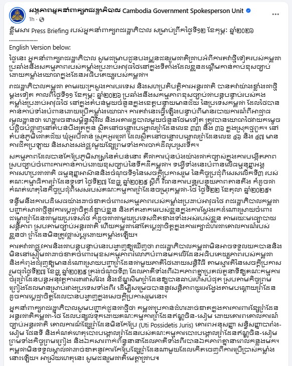 អ្នកនាំពាក្យរាជរដ្ឋាភិបាលសូមបញ្ជាក់ជូនជាថ្មីថា កម្ពុជាប្រកាន់ជំហរដាច់ខាតក្នុងការការពារខ្សែព្រំដែនអន្តរជាតិកម្ពុជា-ថៃ ដែលបន្សល់ទុកដោយគណៈកម្មការព្រំដែនឥណ្ឌូចិន-សៀម ដោយគោរពគោលការណ៍ច្បាប់អន្តរជាតិ គោលការណ៍ខ្សែព្រំដែនមិនកែប្រែ (Uti Possidetis Juris) គោរពអនុសញ្ញា សន្ធិសញ្ញាបារាំង-សៀម ផែនទី និងកំណត់ហេតុបោះបង្គោលព្រំដែនរបស់គណៈកម្មការបោះបង្គោលព្រំដែនឥណ្ឌូចិន-សៀម ព្រមទាំងកិច្ចព្រមព្រៀង និងឯកសារពាក់ព័ន្ធនានាដែលភាគីទាំងពីរបានឯកភាពគ្នានាពេលកន្លងមក។ កម្ពុជាមិនទទួលស្គាល់ជាដាច់ខាតនូវការកែប្រែខ្សែព្រំដែនណាមួយដែលកើតចេញពីការប្រើប្រាស់កម្លាំងនោះឡើយ។ អាស្រ័យហេតុនេះ សូមជនរួមជាតិមេត្តាជ្រាប៕