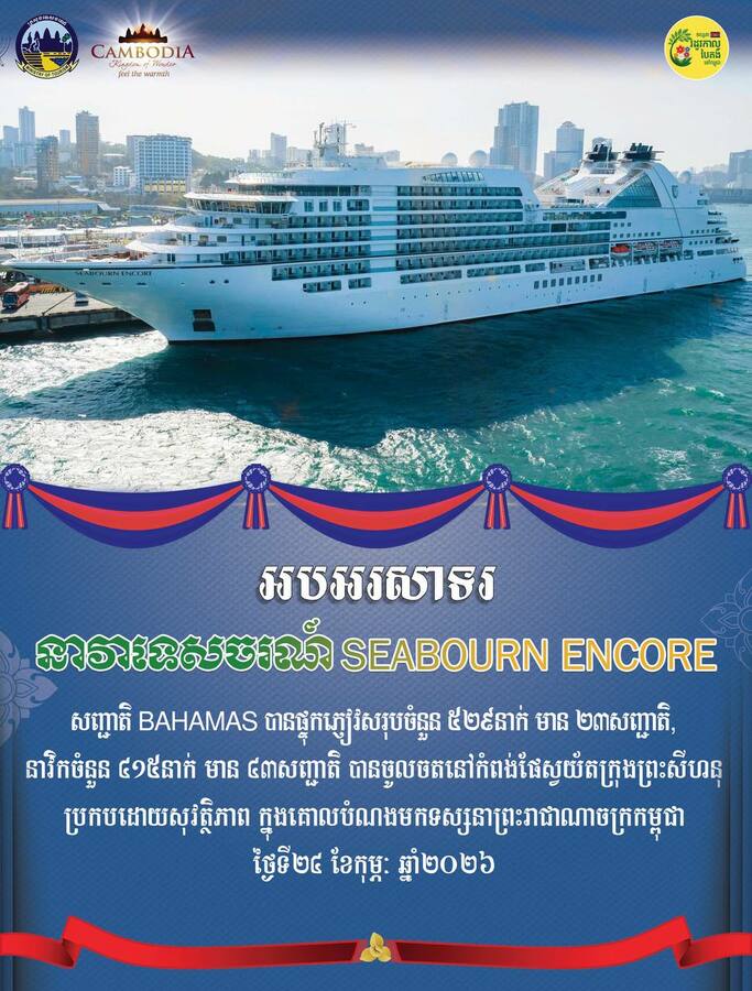 ខេត្តព្រះសីហនុ ថ្ងៃទី២៤ ខែកុម្ភៈ ឆ្នាំ២០២៦ ក្រោមការចង្អុលបង្ហាញពីឯកឧត្តម ហួត ហាក់ រដ្ឋមន្ត្រីក្រសួងទេសចរណ៍ មន្ទីរទេសចរណ៍ខេត្តព្រះសីហនុ បានអញ្ជើញទទួលស្វាគមន៍យ៉ាងកក់ក្តៅដល់ភ្ញៀវទេសចរ ចំនួន ៥២៩នាក់ ដែលមាន ២៣សញ្ជាតិ និងនាវិកចំនួន ៤១៥នាក់ ដែលមាន ៤៣សញ្ជាតិ បានចុះពីនាវាទេសចរណ៍ SEABOURN ENCORE សញ្ជាតិ BAHAMAS មានបណ្ដោយប្រវែង ២១០.៥០ម៉ែត្រ និងទទឹងប្រវែង២៨ម៉ែត្រ ជម្រៅ៦ម៉ែត្រ និងបានចង្អុលណែនាំអំពីតំបន់សក្តានុពលទេសចរណ៍សំខាន់ៗរបស់ខេត្តព្រះសីហនុ ជូនភ្ញៀវបានយ៉ាងល្អប្រសើរ។