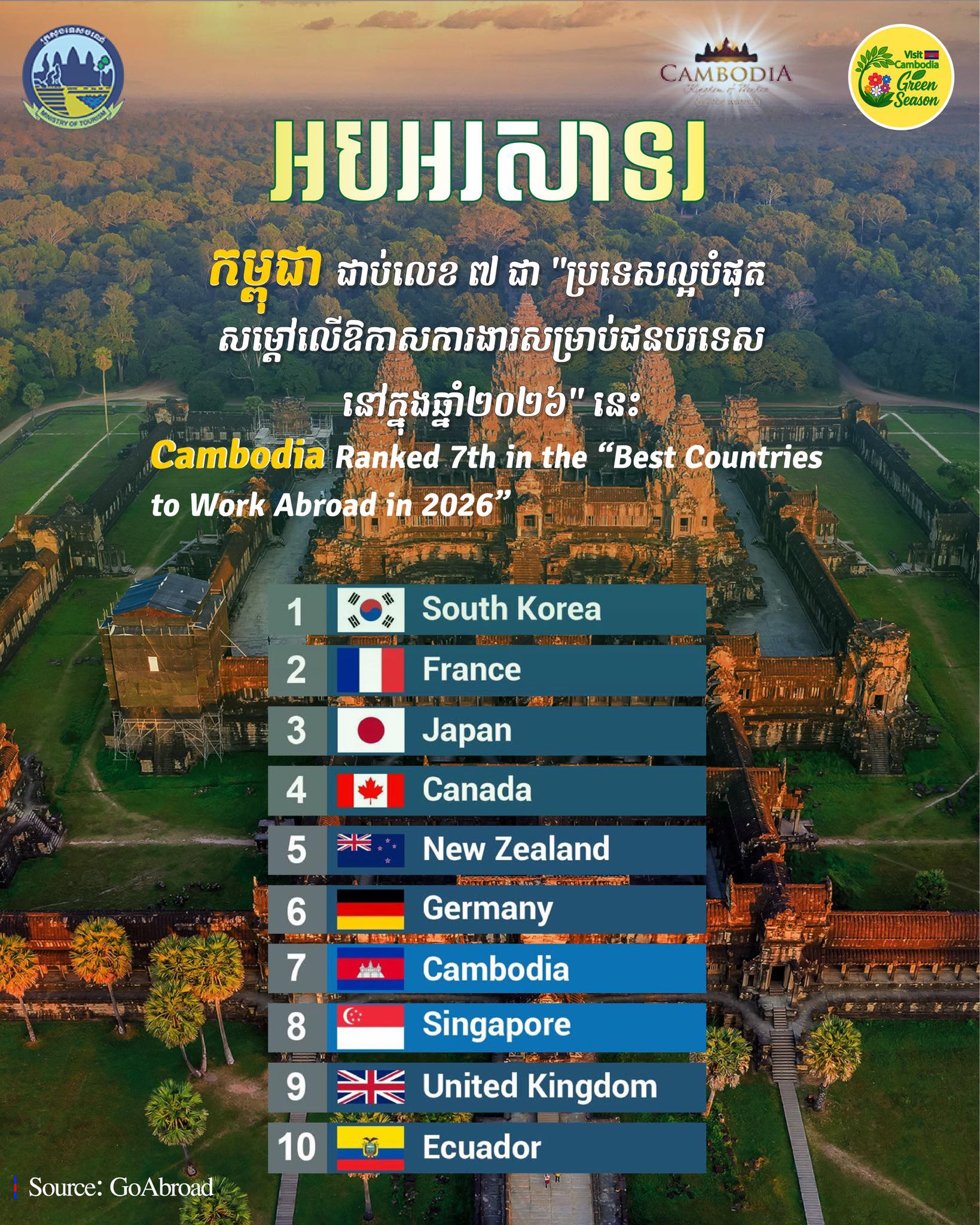 ក្រសួងព័ត៌មាន នាថ្ងៃ ពុធ ទី២៥ ខែកុម្ភៈ ឆ្នាំ២០២៦ នេះ បានចុះផ្សាយថា កម្ពុជា ជាប់លេខ៧ ជា “ប្រទេសល្អបំផុត សម្តៅលើឱកាសការងារ សម្រាប់ជនបរទេស នៅក្នុងឆ្នាំ២០២៦” នេះ។ នេះបើយោងតាមការបញ្ជាក់ពីក្រសួងទេសចរណ៍ នាព្រឹកថ្ងៃទី២៥ ខែកុម្ភៈ ឆ្នាំ២០២៦នេះ។