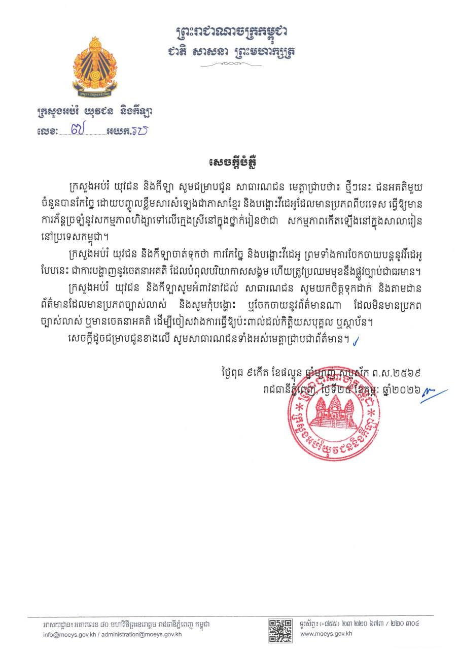 ជាមួយគ្នានេះ ក្រសួងអប់រំ យុវជន និងកីឡា បានចាត់ទុកថា ការកែច្នៃ និងបង្ហោះវីដេអូ ព្រមទាំងការចែកចាយបន្តនូវវីដេអូបែបនេះ ជាការបង្ហាញនូវចេតនាអគតិ ដែលបំពុលបរិយាកាសសង្គម ហើយត្រូវប្រឈមមុខនឹងផ្លូវច្បាប់ជាធរមាន។ ក្រសួងអប់រំ យុវជន និងកីឡា សូមអំពាវនាវដល់ សាធារណជន សូមយកចិត្តទុកដាក់ និងតាមដាន ព័ត៌មានដែលមានប្រភពច្បាស់លាស់ និងសូមកុំបង្ហោះ ឬចែកចាយនូវព័ត៌មានណា ដែលមិនមានប្រភពច្បាស់លាស់ ឬមានចេតនាអគតិ ដើម្បីចៀសវាងការធ្វើឱ្យប៉ះពាល់ដល់កិត្តិយសបុគ្គល ឬស្ថាប័ន៕
