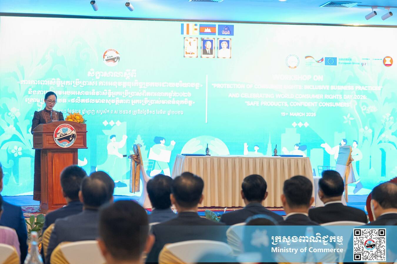 រាជធានីភ្នំពេញ៖ យោងតាមការចុះផ្សាយរបស់ ក្រសួងព័ត៌មាន បានឱ្យដឹងថា លោកជំទាវ ចម និម្មល រដ្ឋមន្ត្រីក្រសួងពាណិជ្ជកម្ម អញ្ជើញជាអធិបតីពិធីបើកសិក្ខាសាលា ស្តីពី «ការការពារសិទ្ធិអ្នកប្រើប្រាស់៖ ការអនុវត្តធុរកិច្ចប្រកបដោយបរិយាបន្ន» និងចូលរួមអបអរសាទរទិវាសិទ្ធិអ្នកប្រើប្រាស់ពិភពលោកឆ្នាំ២០២៦ ក្រោមប្រធានបទ «ផលិតផលមានសុវត្ថិភាព អ្នកប្រើប្រាស់មានទំនុកចិត្ត» នាព្រឹកថ្ងៃទី១៥ ខែមីនា ឆ្នាំ២០២៦ នៅសណ្ឋាគារកាំបូឌីយ៉ាណា រាជធានីភ្នំពេញ។