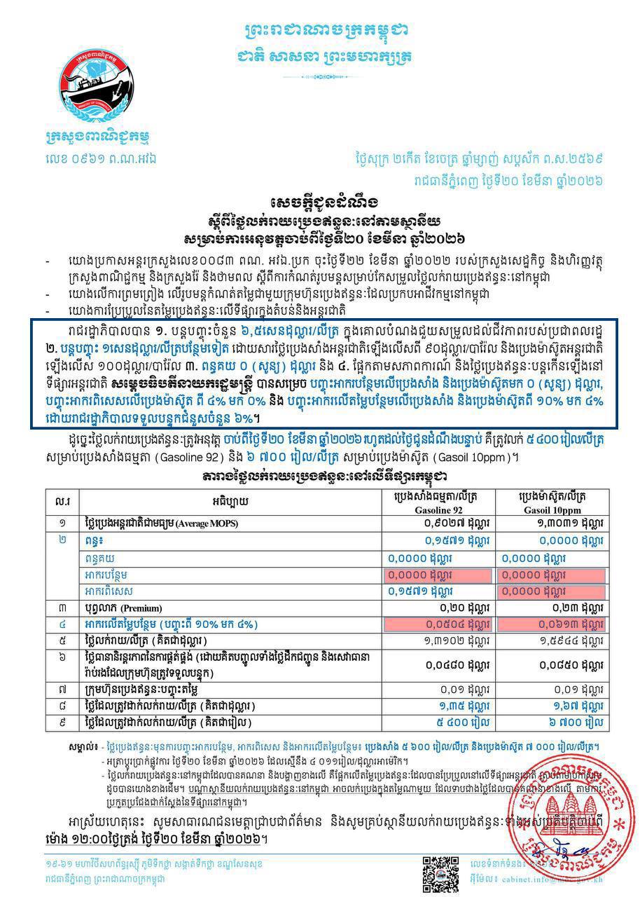 សម្តេចធិបតី ហ៊ុន ម៉ាណែត៖ស្ថិតក្នុងដំណាក់កាលដ៏លំបាកនៃការប្រែប្រួលកេីនឡេីងតម្លៃប្រេងឥន្ទន:ជាសកលនេះ រាជរដ្ឋាភិបាលកម្ពុជា បានដាក់ចេញនូវវិធានការខាងលេី តាមរយ:ក្រសួងជំនាញដូចជា៖ ក្រសួងសេដ្ឋកិច្ច និងហិរញ្ញវត្ថុ, ក្រសួងពាណិជ្ជកម្ម និង ក្រសួងរ៉ែ និងថាមពល តាមរយ:សេចក្តីជូនដំណឹងស្តីពីថ្លៃលក់រាយប្រេងឥន្ទន:នៅតាមស្ថានីយ សម្រាប់ការអនុវត្តចាប់ពីថ្ងៃទី២០ មីនា ២០២៦ ដោយបានសម្រេច៖