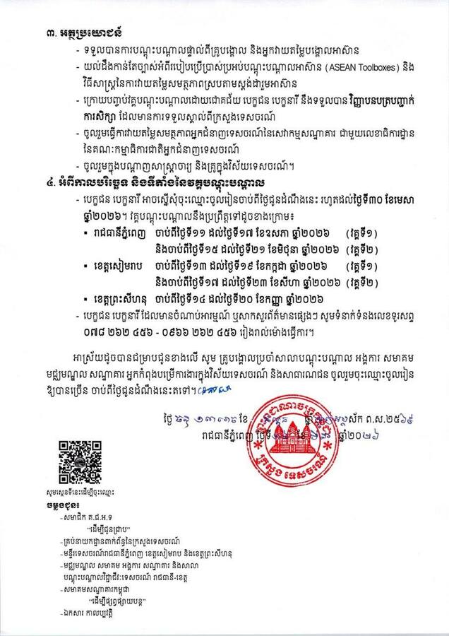 សម្រាប់ព័ត៌មានបន្ថែម សូមទំនាក់ទំនងតាមលេខទូរសព្ទ៖ ០៧៨ ២៦២ ៤៥៦ និង ០៩៦៦ ២៦២ ៤៥៦ ឬចុះឈ្មោះតាមប្រព័ន្ធ QR Code ដូចមានក្នុងសេចក្តីជូនដំណឹង៕