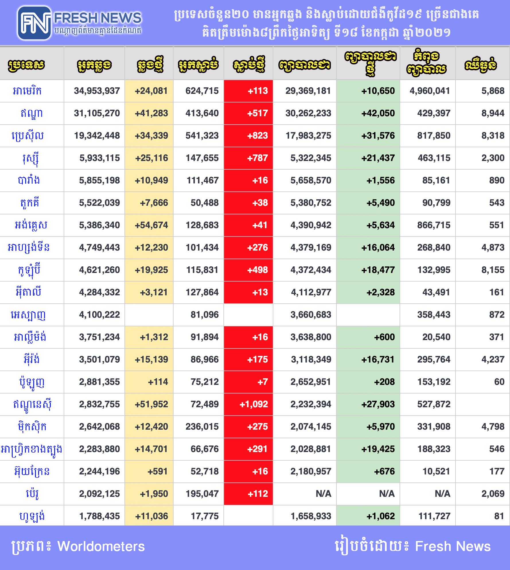 យោងតាមទិន្នន័យពីគេហទំព័រអន្តរជាតិ Worldometer បានបង្ហាញថា ការរីករាលដាលនៃជំងឺកូវីដ១៩ នៅតែមានសភាពស្រួចស្រាវចំនួនអ្នកឆ្លង និងស្លាប់ថ្មីនៅតែមានចំនួនច្រើន។