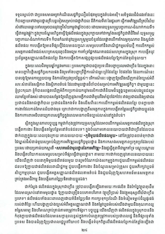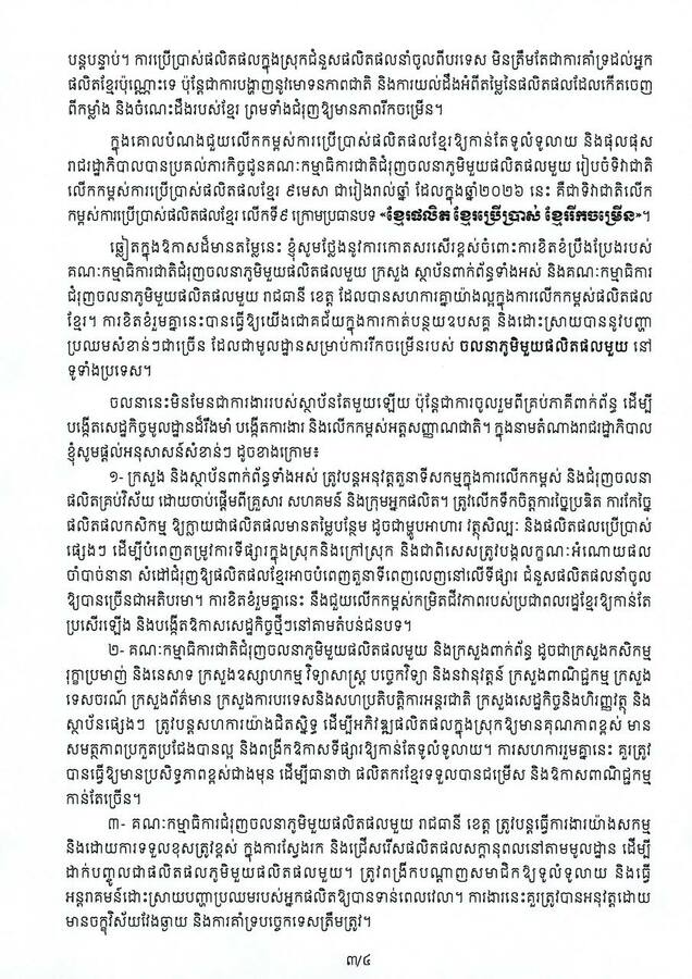 សម្ដេចធិបតី បានគូសបញ្ជាក់ថា «ខ្ញុំសូមអំពាវនាវឱ្យបងប្អូនប្រជាពលរដ្ឋទាំងអស់ បន្តគាំទ្រផលិតផលខ្មែរ ដោយជឿជាក់លើគុណភាព និងតម្លៃ។ ការជ្រើសរើស និងគាំទ្ររបស់បងប្អូន គឺជាកម្លាំងដ៏សំខាន់ក្នុងការកសាងសេដ្ឋកិច្ចជាតិឱ្យមានភាពរឹងមាំ និងភាពធន់ចំពោះបញ្ហាប្រឈមគ្រប់ប្រភេទ។ យើងខិតខំផលិត យើងជួយប្រើប្រាស់ ជាតិយើងនឹងរីកចម្រើន»។