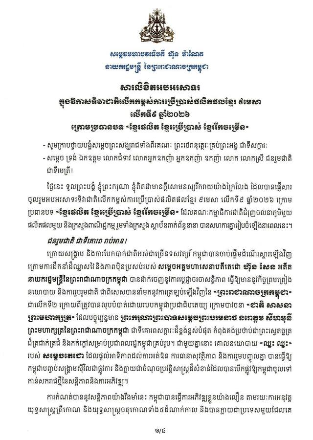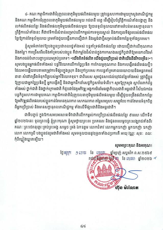 ភ្នំពេញ ៖ សម្តេចមហាបវរធិបតី ហ៊ុន ម៉ាណែត នាយករដ្ឋមន្ត្រីនៃកម្ពុជា បានអំពាវនាវឱ្យប្រជាពលរដ្ឋទាំងអស់ បន្តគាំទ្រផលិតផលខ្មែរ ដោយជឿជាក់លើគុណភាព និងតម្លៃ។ តាមរយៈសារលិខិតអបអរសាទរ ក្នុងឱកាសទិវាជាតិលើកកម្ពស់ការប្រើប្រាស់ផលិតផលខ្មែរ ៩ មេសា លើកទី៩ ឆ្នាំ២០២៦ ក្រោមប្រធានបទ «ខ្មែរផលិត ខ្មែរប្រើប្រាស់ ខ្មែររីកចម្រើន» សម្តេចធិបតី ហ៊ុន ម៉ាណែត បានជំរុញប្រជាពលរដ្ឋខ្មែរ គាំទ្រប្រើប្រាស់ផលិតផលក្នុងស្រុក ដែលផលិតដោយខ្មែរ។