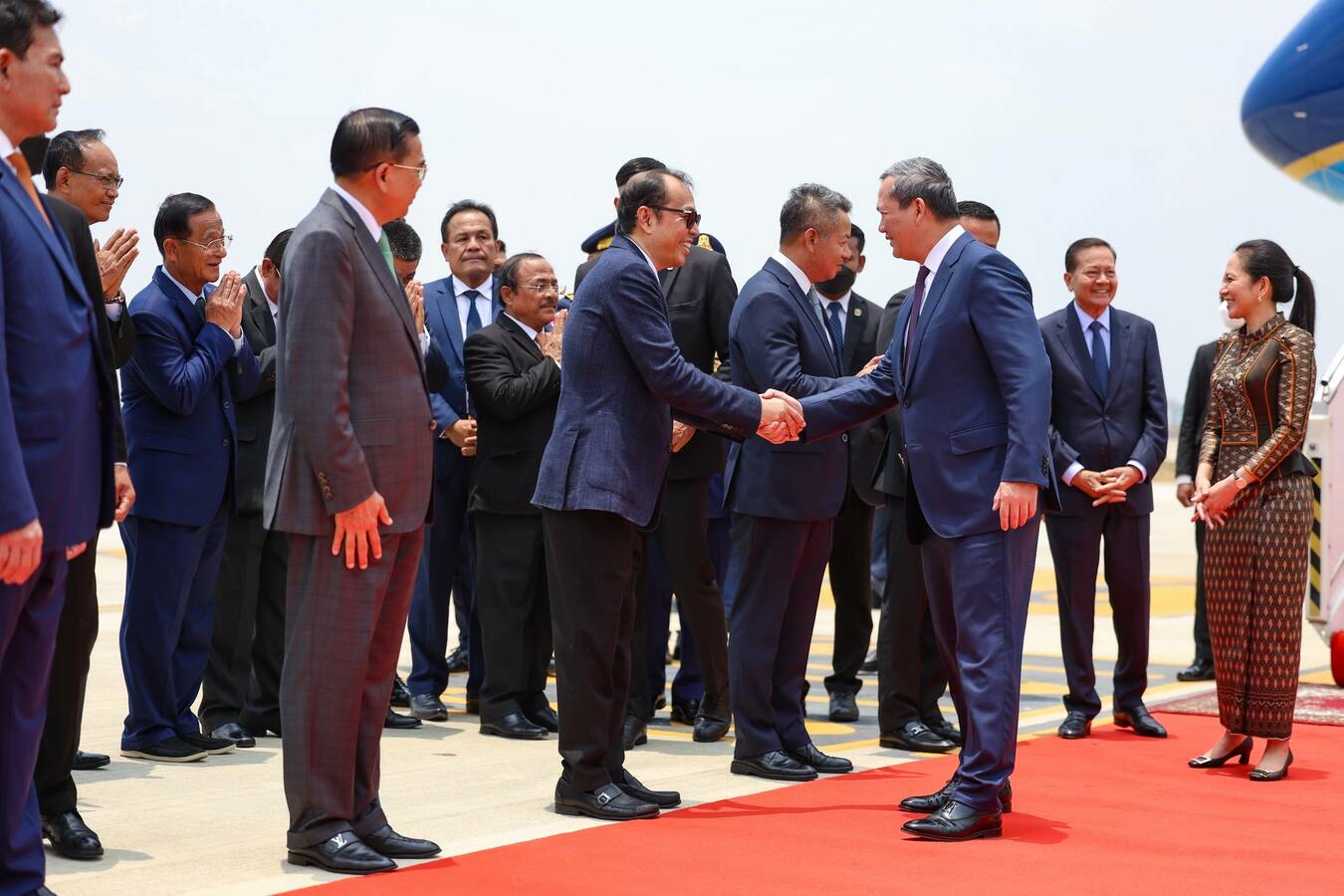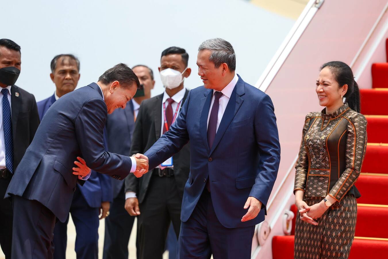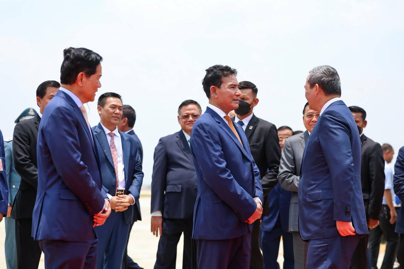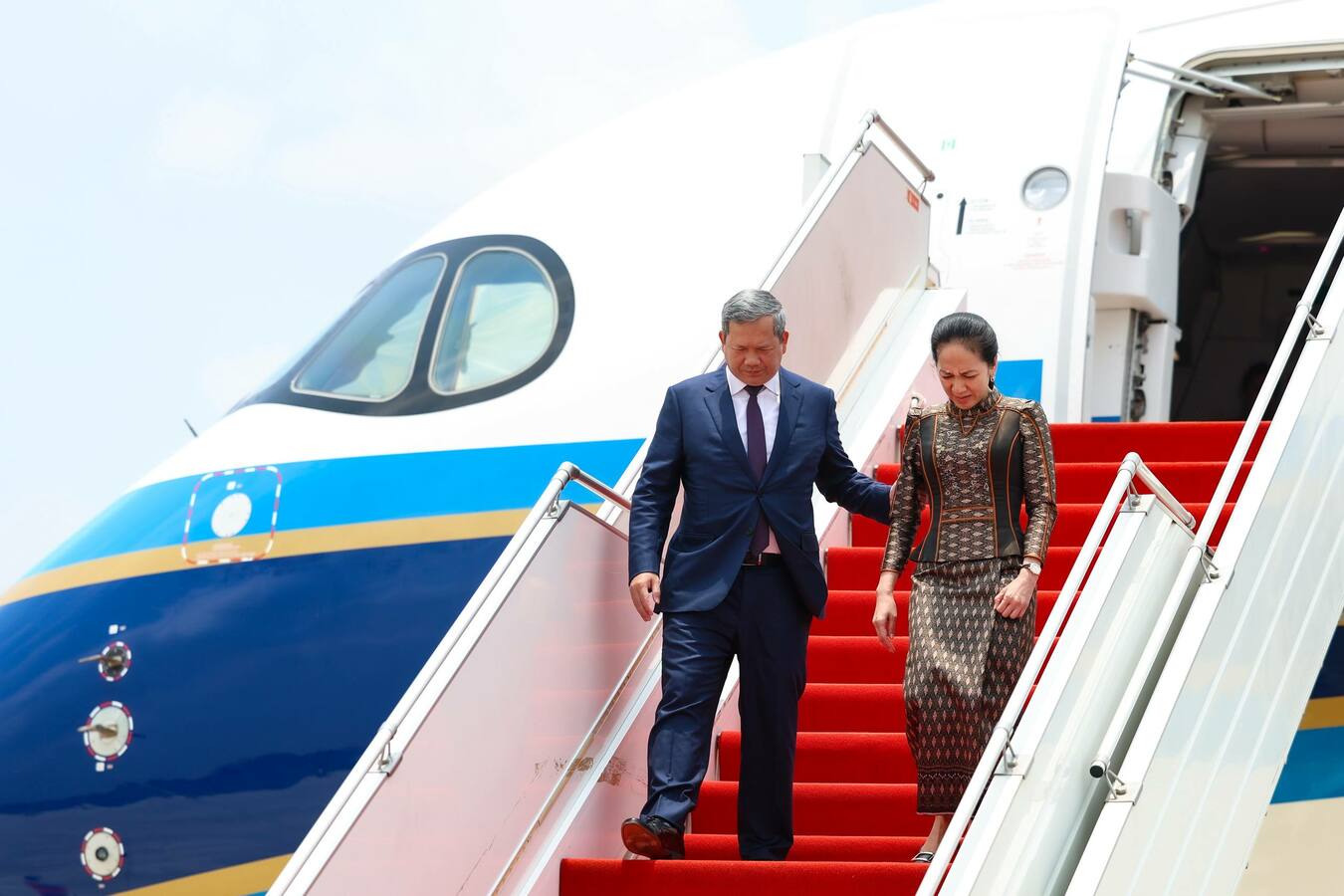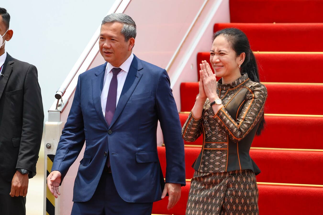 សម្តេចមហាបវរធិបតី ហ៊ុន ម៉ាណែត នាយករដ្ឋមន្ត្រី នៃព្រះរាជាណាចក្រកម្ពុជា និងលោកជំទាវបណ្ឌិត ពេជ ចន្ទមុន្នី ហ៊ុនម៉ាណែត ដឹកនាំគណៈប្រតិភូជាន់ខ្ពស់កម្ពុជា អញ្ជើញមកដល់អាកាសយានដ្ឋានអន្តរជាតិតេជោ ខេត្តកណ្តាល នាព្រឹកថ្ងៃទី៩ ខែមេសា ឆ្នាំ២០២៦ បន្ទាប់ពីបានអញ្ជើញទៅចូលរួម “កិច្ចប្រជុំកំពូលស្តីពីសុខភាពតែមួយ” និងធ្វើទស្សនកិច្ចការងារ នៅទីក្រុងលីយ៉ុង និងទីក្រុងប៉ារីស តបតាមការអញ្ជើញរបស់ ឯកឧត្តម Emmanuel Macron ប្រធានាធិបតីសាធារណរដ្ឋបារាំង។