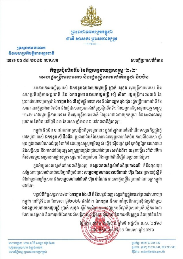 តបតាមការអញ្ជើញរបស់ ឯកឧត្តម ឧបនាយករដ្ឋមន្ត្រី ប្រាក់ សុខុន រដ្ឋមន្ត្រីការបរទេស និង សហប្រតិបត្តិការអន្តរជាតិ និង ឯកឧត្តម ឧបនាយករដ្ឋមន្ត្រី ទៀ សីហា រដ្ឋមន្ត្រីការពារជាតិ នៃ ព្រះរាជាណាចក្រកម្ពុជា ឯកឧត្តម វ៉ាង យី រដ្ឋមន្ត្រីការបរទេស និងឯកឧត្តម តុង ជុន រដ្ឋមន្ត្រីការពារជាតិ នៃសាធារណរដ្ឋប្រជាមានិតចិន នឹងធ្វើជាសហប្រធាននៃកិច្ចប្រជុំលើកទី១ នៃយន្តការកិច្ចសន្ទនាយុទ្ធសាស្ត្រ «២+២» រវាងរដ្ឋមន្ត្រីការបរទេស និងរដ្ឋមន្ត្រីការពារជាតិ នៃព្រះរាជាណាចក្រកម្ពុជា និងសាធារណរដ្ឋ ប្រជាមានិតចិន នៅថ្ងៃទី២២ ខែមេសា ឆ្នាំ២០២៦ នៅរាជធានីភ្នំពេញ។