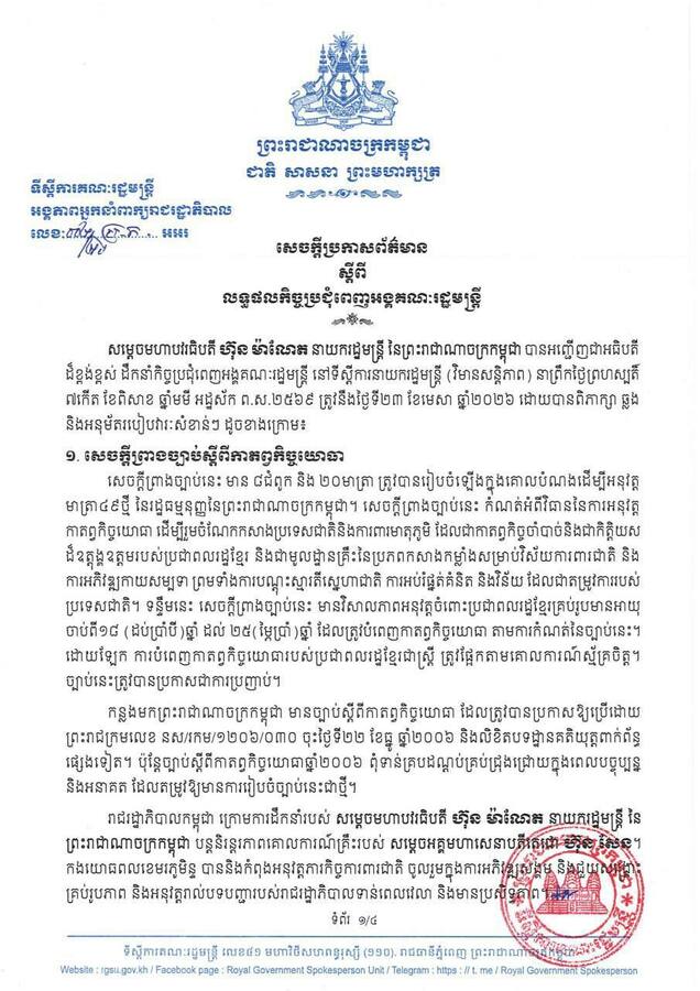 ប្រភពដដែល បានបន្តថា គណៈរដ្ឋមន្ត្រីកម្ពុជា បានស្នើឱ្យច្បាប់នេះត្រូវបានប្រកាសជាការប្រញាប់។