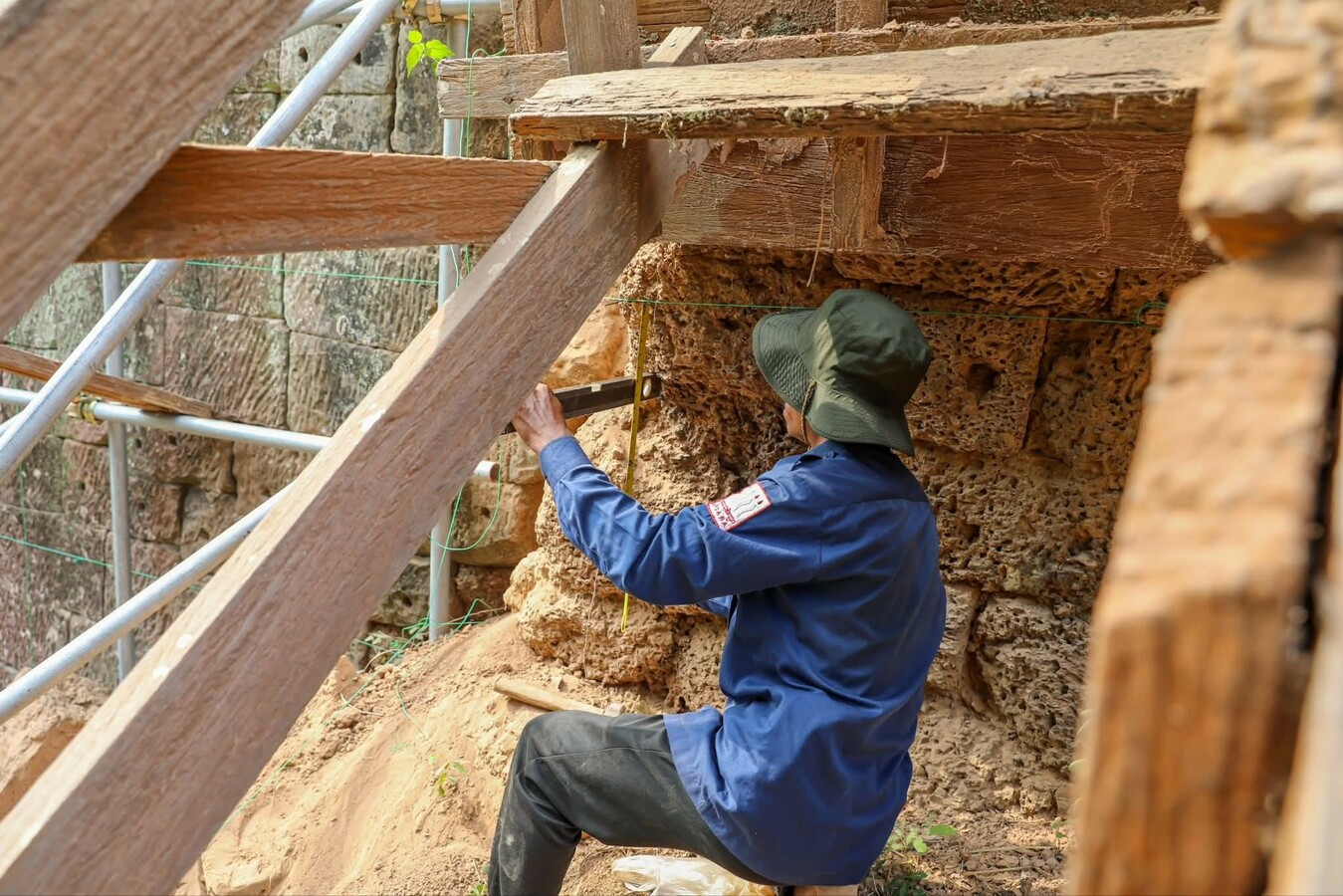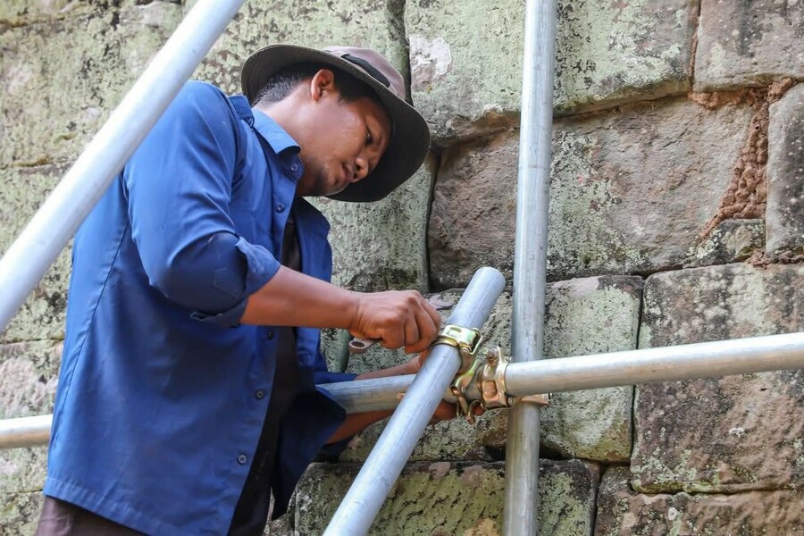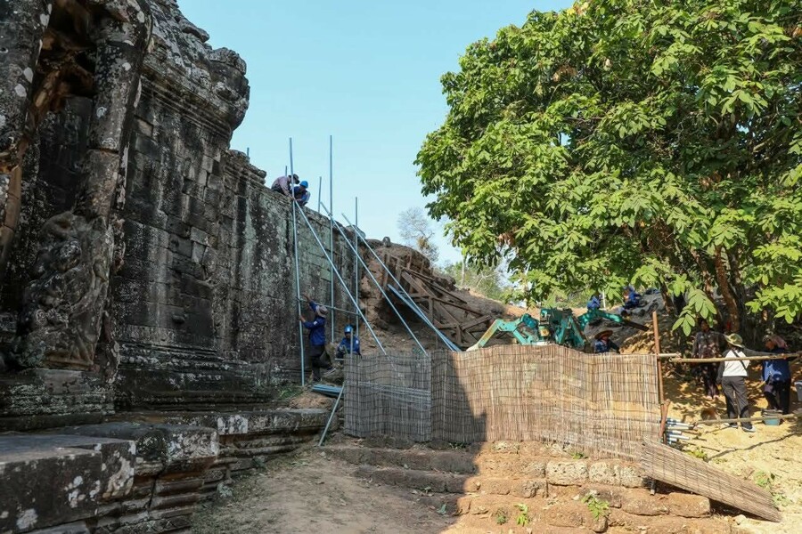 អាជ្ញាធរជាតិអប្សរា កំពុងជួសជុលជញ្ជាំងថ្មបាយក្រៀម ផ្នែកខាងត្បូង ឆៀងខាងលិចរបស់កំពែងក្រុងអង្គរធំ