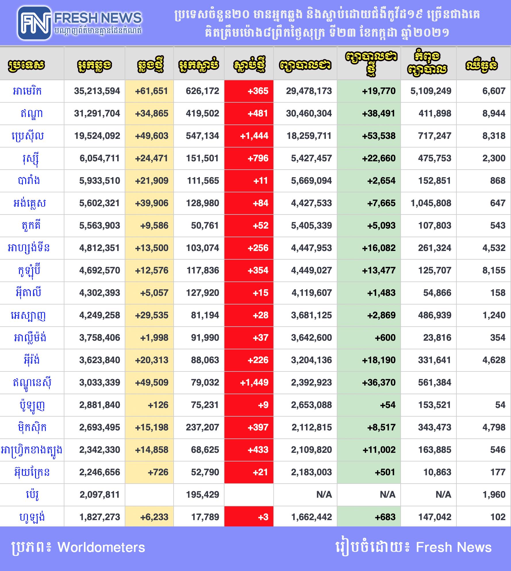 BREAKING: អ្នកឆ្លង COVID-19 លើលោកកើនដល់ជាង ១៩៣លាន ៤១ម៉ឺននាក់ បាត់បង់ជីវិតជាង ៤លាន ១៥ម៉ឺននាក់ និងជាសះស្បើយជាង ១៧៥លាន ៧២នាក់!