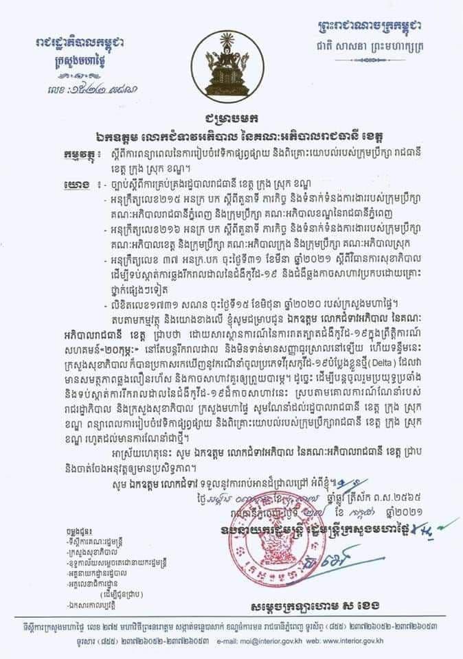 (ភ្នំពេញ)៖ សម្ដេចក្រឡាហោម ស ខេង ឧបនាយករដ្ឋមន្ដ្រី រដ្ឋមន្ដ្រីក្រសួងមហាផ្ទៃ នៅថ្ងៃទី២៧ ខែកក្កដា ឆ្នាំ២០២១នេះ បានផ្ញើលិខិតទៅកាន់អភិបាលរាជធានី-ខេត្ត ឱ្យពន្យារពេលនៃការរៀបចំវេទិកាផ្សព្វផ្សាយ និងពិគ្រោះយោបល់របស់ក្រុមប្រឹក្សារាជធានី ខេត្ត ក្រុង ស្រុក ខណ្ឌ។