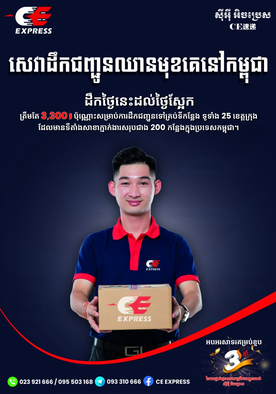 ស៊ីអ៉ី អិចប្រេស (CE EXPRESS) សេវាកម្មដឹកជញ្ជូនរហ័សទាន់ចិត្ត ដែលផ្ដល់ជូននូវទំនុកចិត្តខ្ពស់ និងតម្លៃសមរម្យបំផុតដែលមិនធ្លាប់មាន។