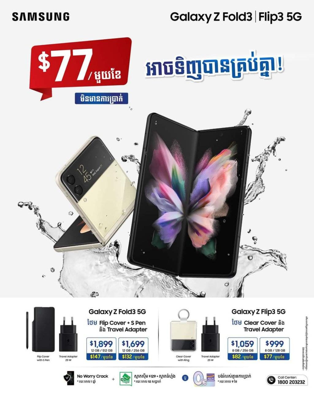 នៅមានលក្ខណៈពិសេសច្រើនទៀតដែលធ្វើឱ្យកំពូលស្មាតហ្វូនអេក្រង់បត់ Galaxy Z Fold3 5G និង Galaxy Z Flip3 5G អង្រួនចិត្តអ្នកប្រើប្រាស់ស្មាតហ្វូនអេក្រង់បត់ប្រចាំសករាជថ្មីឆ្នាំ 2021 នេះ…!ចឹងរង់ចាំមើលនូវការបង្ហាញជាបន្ទាប់ទៀតណា៎..! អូហ៎…នៅមានរឿងមួយភ្លេចប្រាប់អ្នកទាំងអស់គ្នា បើលោកអ្នកចង់បានតារាទាំង 2 ដួងនេះមកប្រើប្រាស់ប៉ុន្តែលោកអ្នកពុំទាន់មានថវិកាគ្រប់គ្រាន់នោះឥឡូវឈប់កង្វល់ទៀតទៅព្រោះថា សាមសុង តែងតែយល់ចិត្តអ្នកប្រើប្រាស់ក៏ដូចជាអតិថិជនរបស់ខ្លួនជានិច្ច គឺក្រុមហ៊ុនបានផ្តល់ជូននូវកម្មវិធីបង់រំលស់មិនមានការប្រាក់ 0% រយៈពេល 9 ខែ…ចឹងឈប់បារម្ភទៅណា៎…!