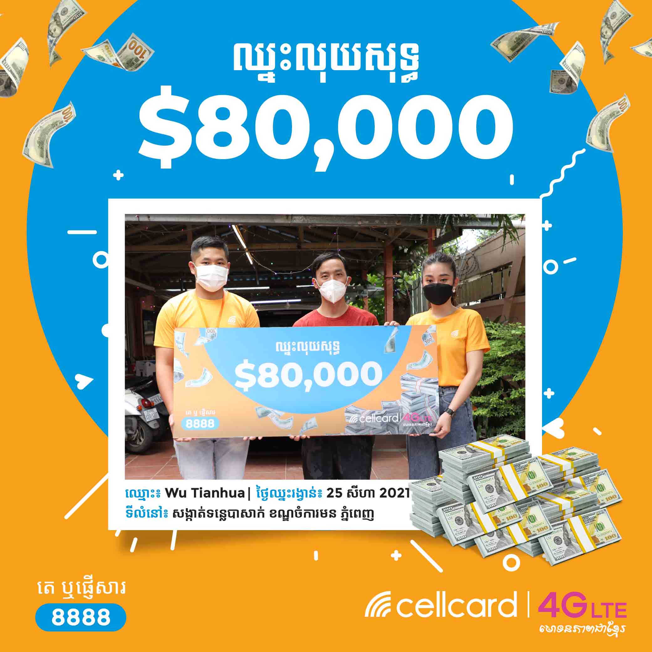 សែលកាត សូមចូលរួមអបអរសាទរដល់អតិថិជនរបស់ខ្លួន ដែលជាជនជាតិចិន បានចូលរួមលេងក្នុងកម្មវិធី “ឈ្នះលុយសុទ្ធ $10,000 រៀងរាល់ថ្ងៃ” ពីសែលកាត ហើយក៍បានឈ្នះរង្វាន់លុយសុទ្ធ $80,000 ដូចសេចក្តីប្រាថ្នារបស់គាត់តែម្តង។ លោក អ៊ូ ធានហ័រ ដែលមានមុខរបរជាអាជីវករម្នាក់ ស្នាក់នៅសង្កាត់ទន្លេបាសាក់ ខណ្ឌចំការមន រាជធានីភ្នំពេញ លោកបានរង្វាន់លុយសុទ្ធ $80,000 កាលពីថ្ងៃទី25 ខែសីហា ឆ្នាំ2021កន្លងទៅនេះ។ លោកបានបង្ហាញពីចំណាប់អារម្មណ៍ថា៖ លោកបានចូលរួមលេងក្នុងកម្មវិធីនេះជារៀងរាល់ថ្ងៃ ហើយដ៏បានឈ្នះរង្វាន់លុយសុទ្ធដ៏ច្រើនសន្ធឹកសន្ធាប់នេះពីក្រុមហ៊ុន សែលកាត ពិតប្រាកដមែន! លោកពិតជារំភើបរីករាយជាខ្លាំង ហើយលុយរង្វាន់នេះនឹងប្រើសម្រាប់ពង្រីកអាជីវកម្មបន្ថែមទៀត។