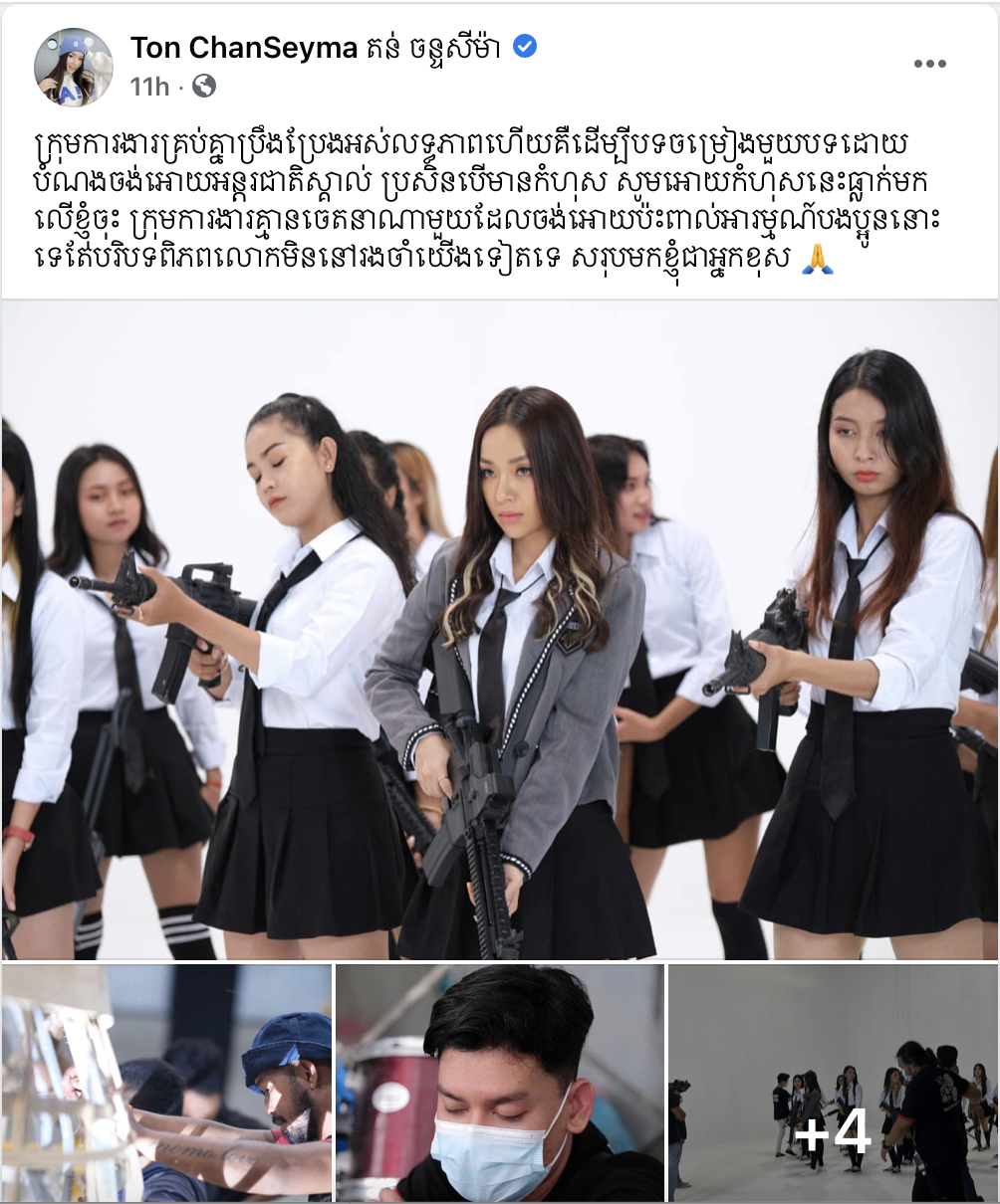 ក្នុងនោះដែរតារាចម្រៀង តន់ ចន្ទសីម៉ា បានបង្ហោះសារនៅលើទំព័រហ្វេសប៊ុករបស់នាងថា៖ “ក្រុមការងារគ្រប់គ្នាប្រឹងប្រែងអស់លទ្ធភាពហើយគឺដើម្បីបទចម្រៀងមួយបទដោយបំណងចង់អោយអន្តរជាតិស្គាល់ ប្រសិនបើមានកំហុស សូមអោយកំហុសនេះធ្លាក់មកលើខ្ញុំចុះ ក្រុមការងារគ្មានចេតនាណាមួយដែលចង់អោយប៉ះពាល់អារម្មណ៍បងប្អូននោះទេតែបរិបទពិភពលោកមិននៅរងចាំយើងទៀតទេ សរុបមកខ្ញុំជាអ្នកខុស”៕ ដោយ៖ ខ្មែរណូត