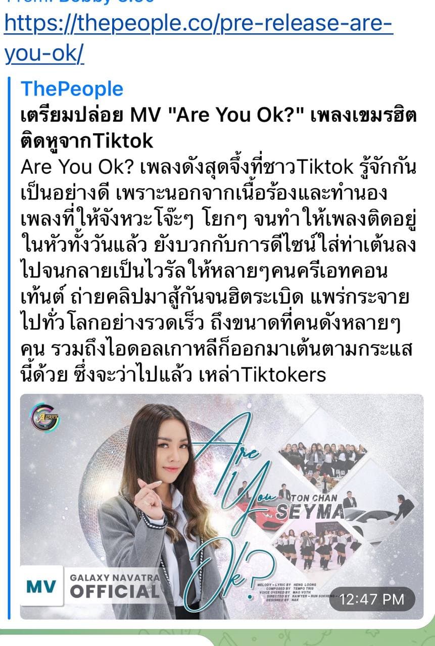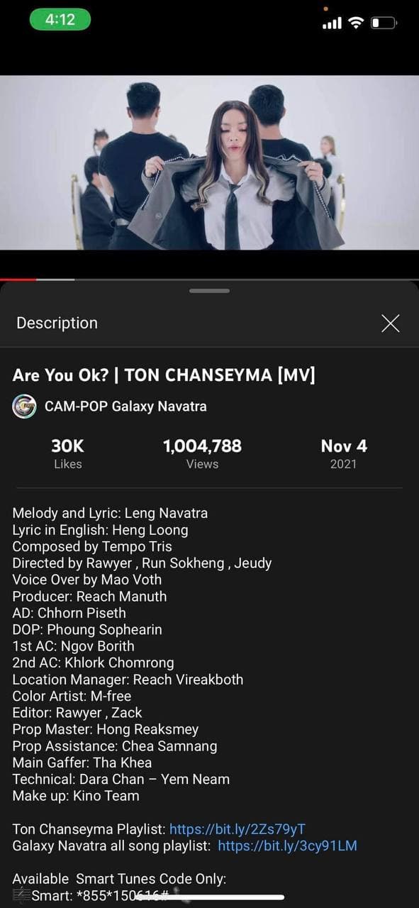 បទ “Are you ok” ត្រូវបានផលិតកម្មGalaxy Navatra បង្ហោះលើ channel youtube ថ្មីមួយរបស់ខ្លួន មានឈ្មោះថា CAM-POP Galaxy Navatra នៅម៉ោង ៧ព្រឹកថ្ងៃទី៤ ខែវិច្ឆិកា ឆ្នាំ២០២១នេះ បើគិតដល់ម៉ោង៤រៀលថ្ងៃដដែលនេះ ពោលត្រឹមតែ ៩ម៉ោងប៉ុណ្ណោះ មានអ្នកចូលទស្សនាច្រើនលើសលប់។
