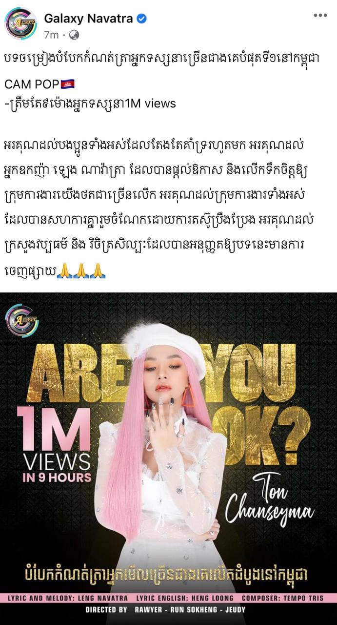 អាចនិយាយបានថា បទ “Are you ok” របស់ផលិតកម្មGalaxy Navatra បទជាចម្រៀងដំបូងបំបែកកំណត់ត្រាអ្នកមើលច្រើនជាងគេនៅកម្ពុជា ក្នុងរយៈពេលខ្លី ត្បិតអីគ្រាន់តែផុសមិនដល់ ៩ម៉ោងផង មានអ្នកចូលទស្សនារហូតដល់ទៅជាង ១លានដងទៅហើយ។