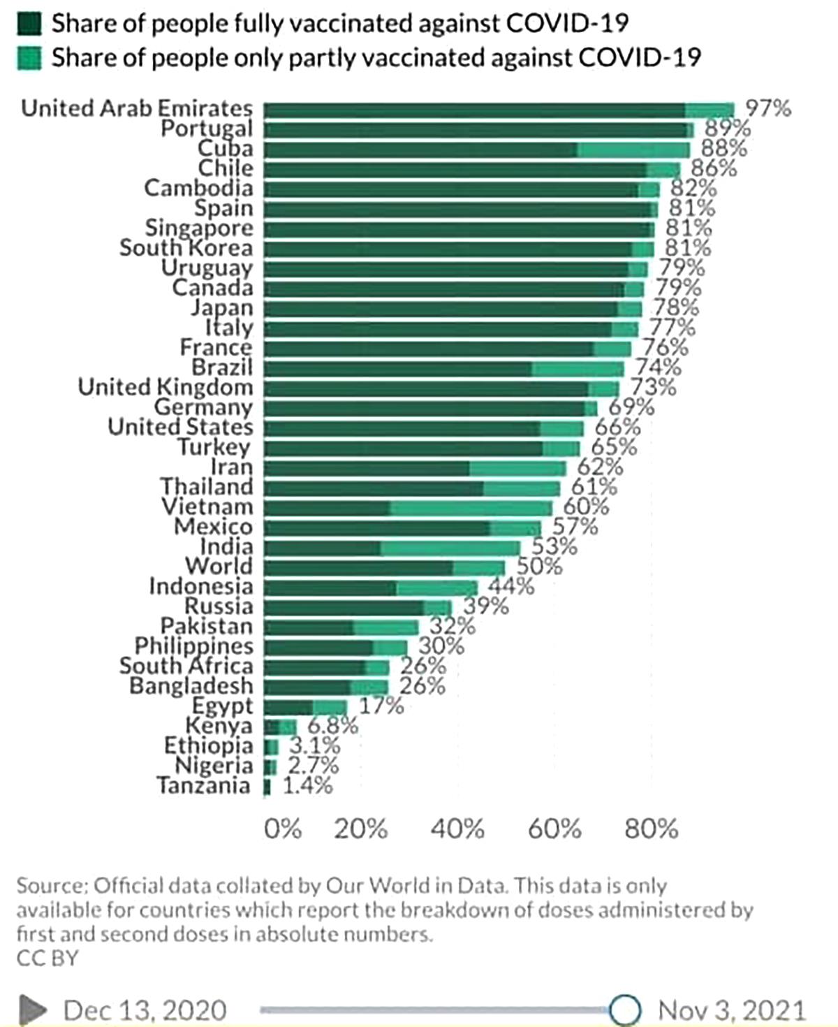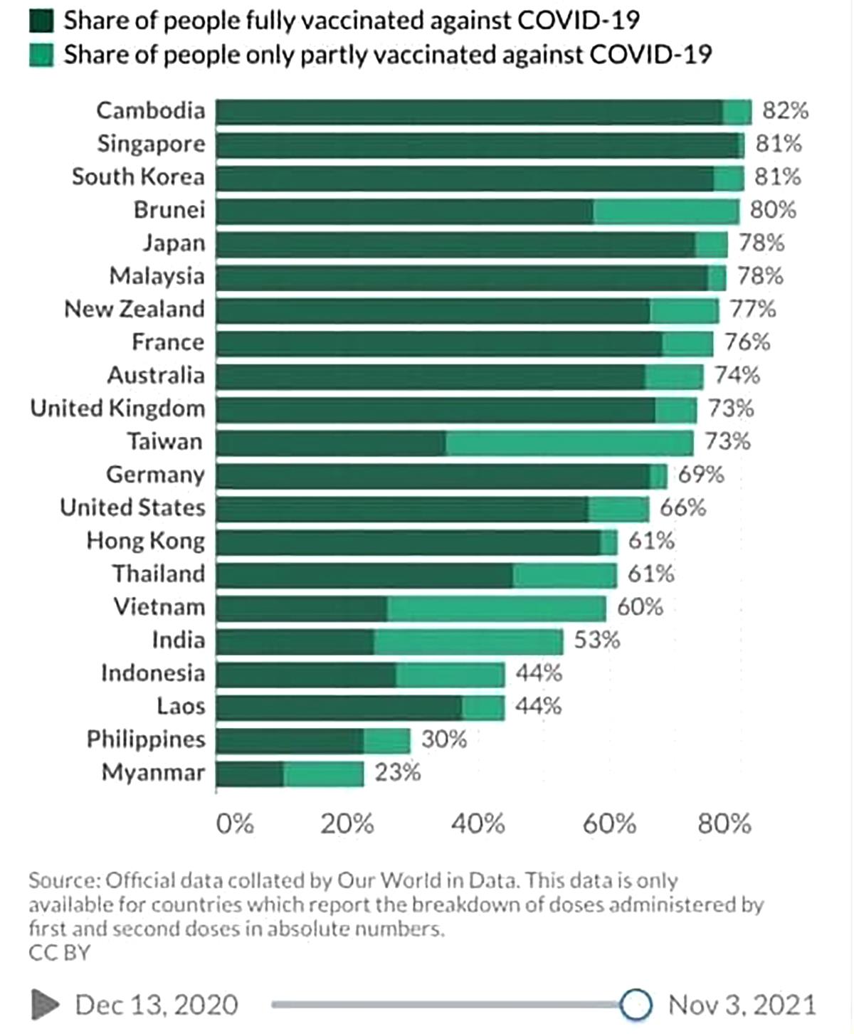 (បរទេស)៖ យោងតាមទិន្នន័យរៀបរៀងដោយវែបសាយ Our World in Data ដែលតាមដានជាប់ជានិច្ចចំពោះ អត្រាចាក់វ៉ាក់សាំងបង្ការជំងឺ COVID-19 នៅទូទាំងពិភពលោកបានបង្ហាញឲ្យឃើញថា គិតត្រឹមថ្ងៃទី០៣ ខែវិច្ឆិកា ឆ្នាំ២០២១ ប្រទេសកម្ពុជានៅតែឈរក្នុងលំដាប់ថ្នាក់លេខ ១ នៅទ្វីបអាស៊ី និងលេខ ៥ លើពិភពលោក ក្នុងនាមជាប្រទេសដែលបានចាក់វ៉ាក់សាំងបង្ការ COVID-19 ក្នុងអត្រាខ្ពស់ជាងគេបំផុត។