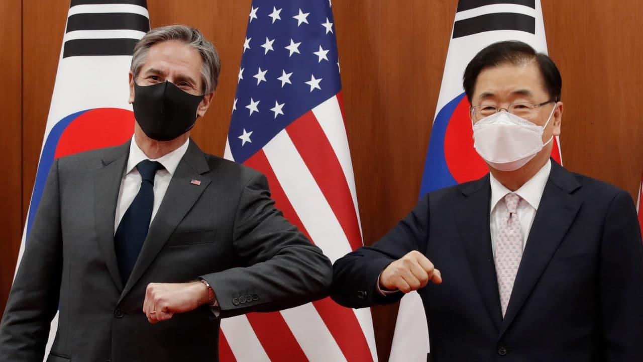 នៅក្នុងកិច្ចសន្ទនាតាមប្រព័ន្ធទូរស័ព្ទ ជាមួយរដ្ឋមន្ត្រីការបរទេសកូរ៉េខាងត្បូងលោក ជុង អ៊ុយយ៉ុង (Chung Eui-yong), លោក Antony Blinken បានថ្លែងយ៉ាងដូច្នេះថា «សម្ព័ន្ធភាពទ្វេភាគីរវាងប្រទេសទាំងពីរ គឺជាស្នូលនៃសន្តិភាព សន្តិសុខ និងវិបុលភាពនៅទូទាំងតំបន់ឥណ្ឌូ-ប៉ាស៊ីហ្វិក និងតំបន់ឆ្ងាយពីនេះទៀត»។ ប្រមុខការទូតអាមេរិករូបនេះ ក៏បានសង្កត់ធ្ងន់ផងដែរ អំពីភាពចាំបាច់នៃការបន្ត កិច្ចសហប្រតិបត្តិការត្រីភាគីរវាង «អាមេរិក-ជប៉ុន-កូរ៉េខាងត្បូង» ហើយសហរដ្ឋអាមេរិកនឹងនៅតែរក្សាខ្លួនឯងជា «រនាំងដែក» ដើម្បីការពារសន្តិសុខកូរ៉េខាងត្បូងជានិច្ច។