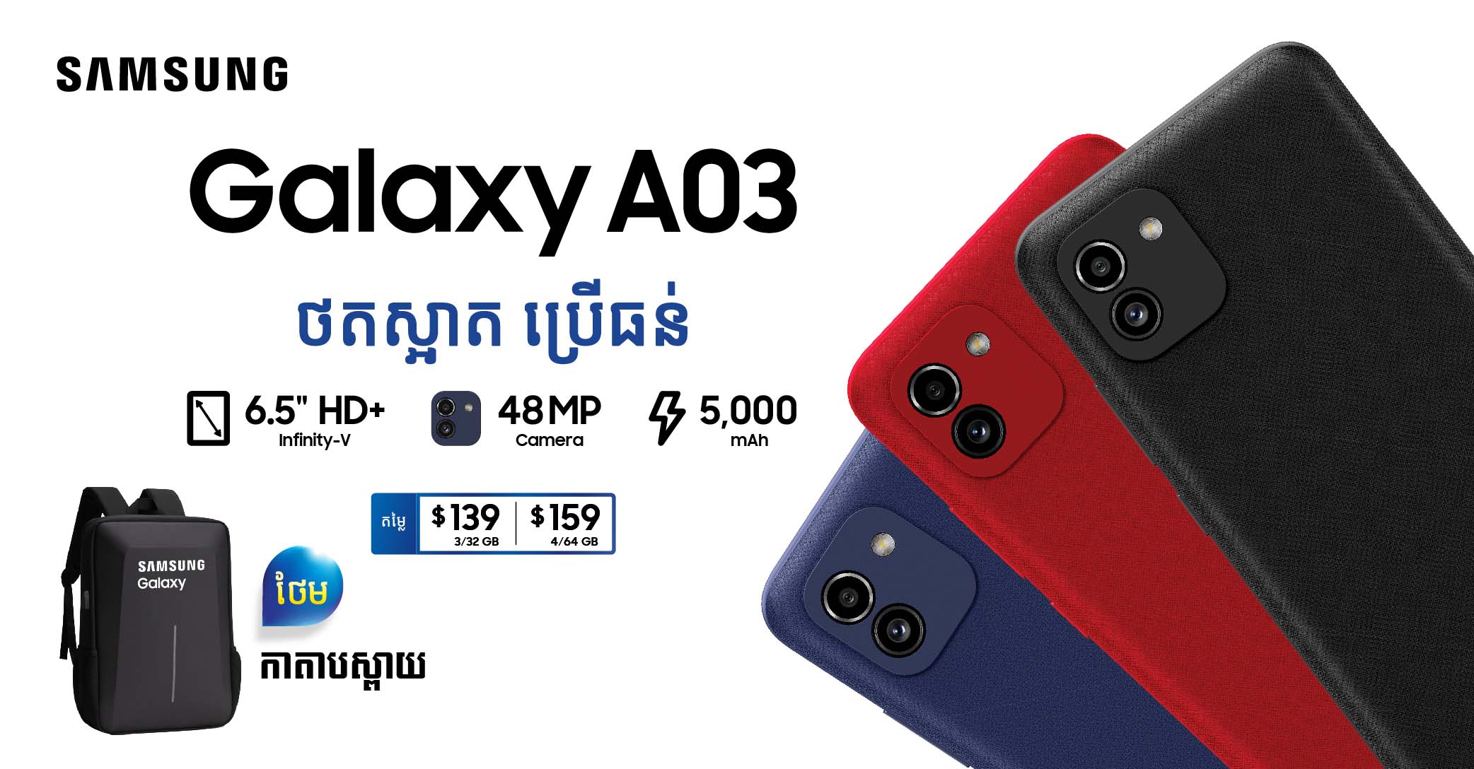 (ភ្នំពេញ) ថ្ងៃទី ២៤ ខែមករា ឆ្នាំ ២០២២៖ បើកក្បាលទំព័រឆ្នាំថ្មីភ្លាម…ក្រុមហ៊ុន សាមសុង ផ្តល់ជូននូវភាពអស្ចារ្យ និងរំភើបជូនអតិថិជនរបស់ខ្លួនភ្លែតតែម្តង…! ជាមួយនឹងការដាក់លក់ជាផ្លូវការនូវស្មាតហ្វូនលំដាប់ថវិកាដែលមានគុណភាពខ្ពស់ហួសពីការរំពឹងទុកជាមួយនឹង កាមេរ៉ាថតរូបបានច្បាស់ស្អាត និងប្រើធន់កម្លាំងថាមពលថ្មខ្លាំង ម៉ូឌែល Galaxy A03 ស៊េរីឆ្នាំ 2022 នេះ អតិថិជនទាំងអស់ក៏នឹងទទួលបាននូវកម្មវិធីប្រូម៉ូសិនថែមជូន កាតាបស្ពាយ ដ៏ស្រស់ស្អាតបន្ថែមទៀតផងដែរ…!