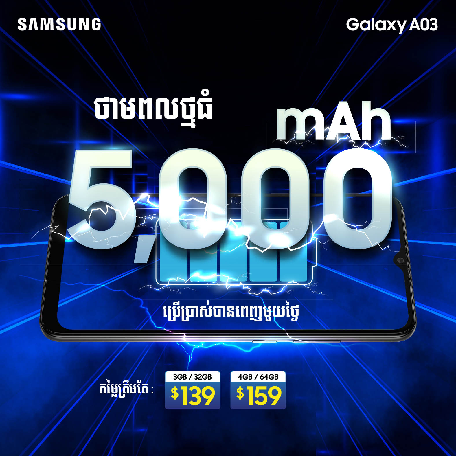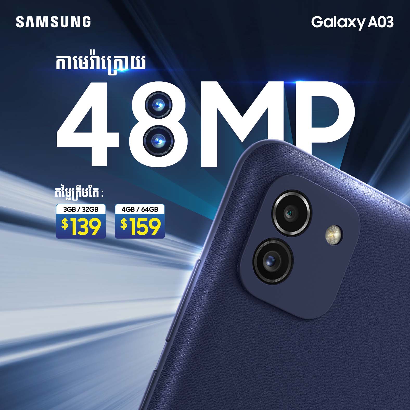 បានទាំងស្មាតហ្វូនសេរីទំនើបចុងក្រោយតម្លៃធូរថ្លៃផង…បានទាំងប្រូម៉ូសិនថែមជូនម៉ាពេញចិត្តផង…! សូមបញ្ជាក់ផងដែរថា Galaxy A03 ស៊េរីថ្មី ឆ្នាំ2022 ដែលក្រុមហ៊ុន សាមសុង ដាក់លក់លើទីផ្សារនាពេលនេះគឺពិតជាមានសមត្ថភាពអស្ចារ្យមិនធម្មតាមែនបើធៀបនឹងផលិតស្មាតហ្វូនដទៃដែលមានតម្លៃប្រហាក់ប្រហែល ឬអាចនិយាយបានថាមានតែក្រុមហ៊ុន សាមសុង ប៉ុណ្ណោះដែលហ៊ានផលិតស្មាតហ្វូនដែលមានសមត្ថភាពខ្ពស់ជាមួយនឹងតម្លៃដ៏សមរម្យបំផុតបែបនេះ…!
