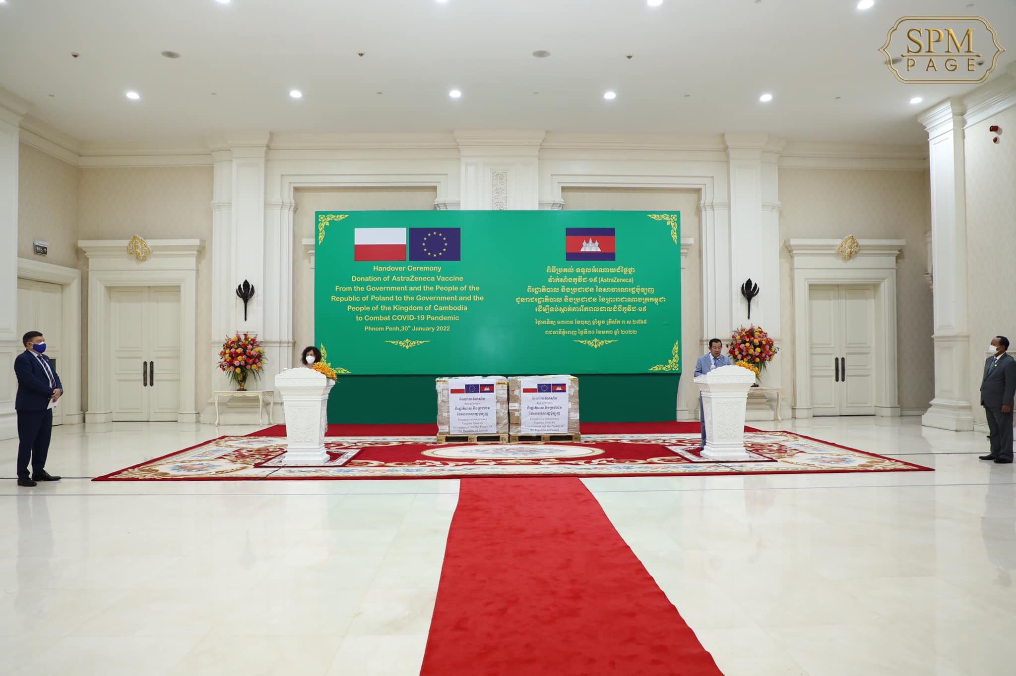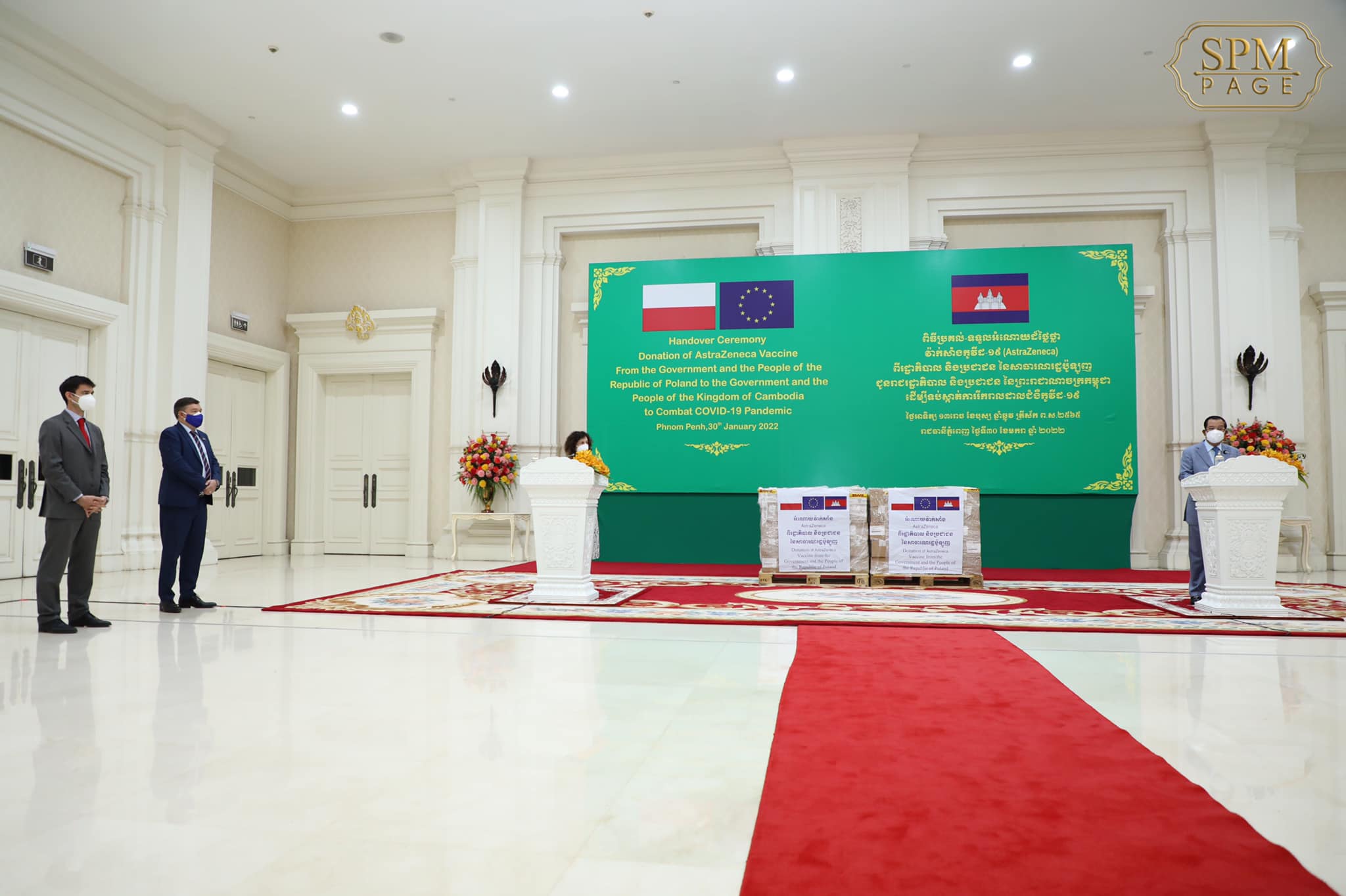 រាជធានីភ្នំពេញ៖ យោងតាមការគណនីហ្វេស ប៊ុករបស់ សម្តេចតេជោ ហ៊ុន សែន នាយករដ្ឋមន្ត្រីនៃព្រះរាជាណាចក្រកម្ពុជា បានឲ្យដឹងថា នៅព្រឹកថ្ងៃអាទិត្យ ១៣រោច ខែបុស្ស ឆ្នាំឆ្លូវ ត្រីស័ក ព.ស. ២៥៦៥ ត្រូវនឹង ថ្ងៃទី៣០ ខែមករា ឆ្នាំ២០២២ នេះ សម្តេចអគ្គមហាសេនាបតីតេជោ ហ៊ុន សែន នាយករដ្ឋមន្ត្រីនៃព្រះរាជាណាចក្រកម្ពុជា បានអញ្ជើញចូលរួមក្នុងពិធីប្រគល់-ទទួល វ៉ាក់សាំងបង្ការជំងឺកូវីដ១៩ (AstraZeneca) ចំនួន៣០ម៉ឺនដូស ជាជំនួយរបស់ប្រទេសប៉ូឡូញ ដែលពិធីនេះធ្វើឡើងនៅវិមានសន្តិភាព រាជធានីភ្នំពេញ។ ពិធីនេះ ក៏មានការអញ្ជើញចូលរួមពី លោកជំទាវ Carmen MORENO ឯកអគ្គរដ្ឋទូតនៃសហភាពអឺរ៉ុបប្រចាំកម្ពុជាផងដែរ។
