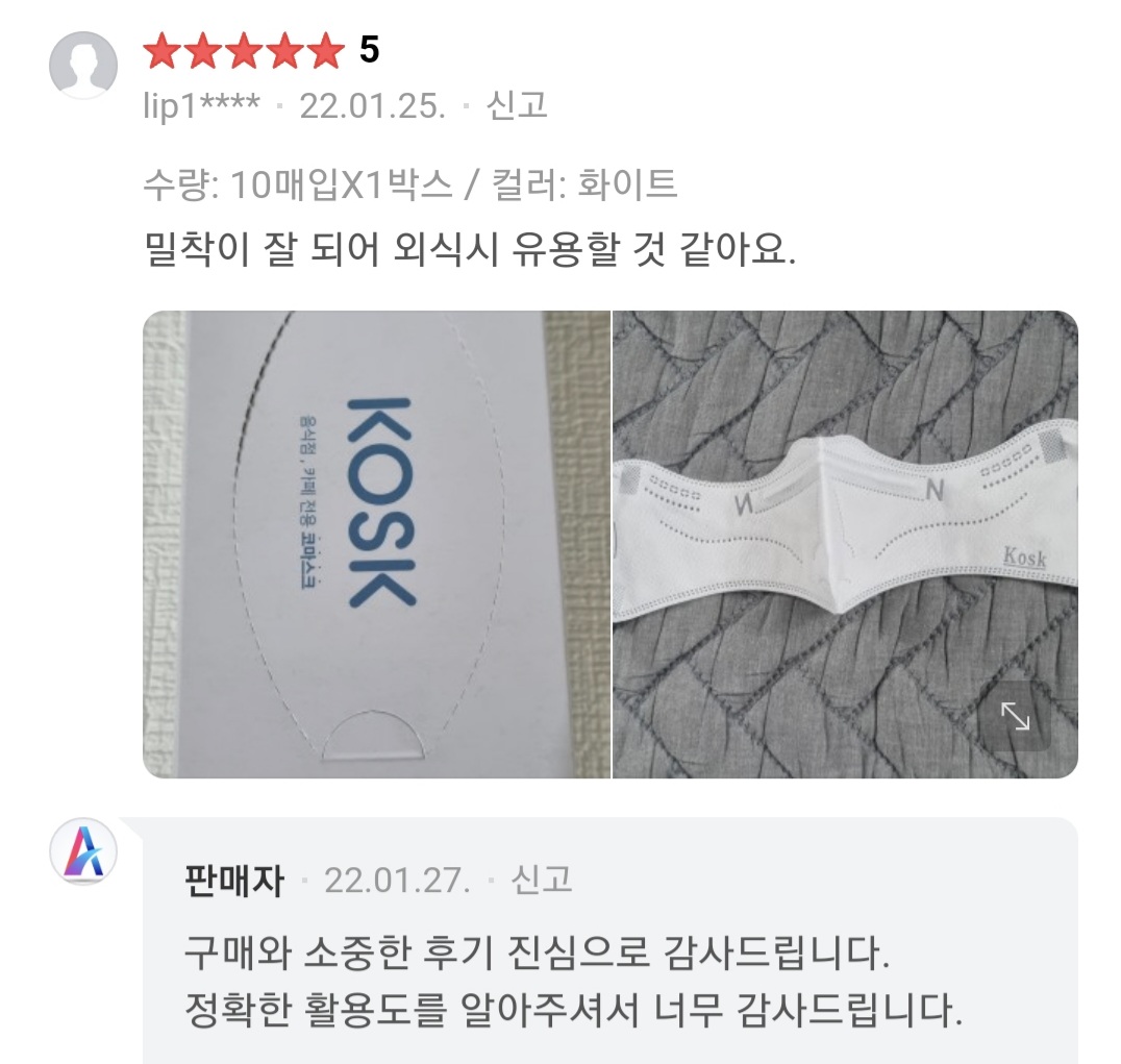 ប្រភពខាងលើបានបន្តថា ម៉ាស “kosk” ត្រូវបានរចនាឡើងដោយមាន ២ ស្រទាប់គឺស្រទាប់លើសម្រាប់ការពារច្រមុះនិងស្រទាប់ក្រោមសម្រាប់ការពារមាត់។ ដូចនេះអ្នកប្រើប្រាស់មានជម្រើស ២ គឺអាចពាក់ទាំង ២ ស្រទាប់ក្នុងពេលតែមួយ ឬអាចដោះស្រទាប់ការពារមាត់ចេញក្នុងពេលញ៉ាំអាហារនិងបន្តពាក់ត្រឹមស្រទាប់សម្រាប់ការពារច្រមុះ។ ចំពោះតម្លៃរបស់ម៉ាស់ប្រភេទ “kosk” វិញគឺត្រូវបានគេដាក់លក់ក្នុងតម្លៃ ៩,៨០០វ៉ុន (៨,១៣ ដុល្លារអាមេរិក) សម្រាប់ម៉ាស ១ប្រអប់ ដែលមានម៉ាសចំនួន ១០នៅក្នុងនោះ៕ ដោយ៖ ខ្មែរណូត