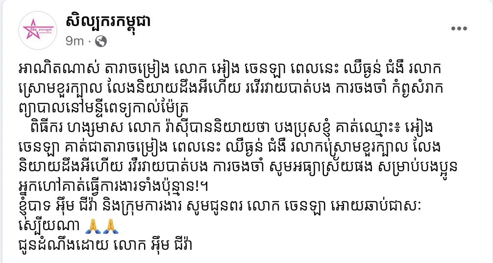 យោងតាមការបញ្ជាក់ពី សិល្បករកម្ពុជា បានឲ្យដឹងថា “អាណិតណាស់ តារាចម្រៀង លោក អៀង ចេនឡា ពេលនេះ ឈឺធ្ងន់ ជំងឺ រលាកស្រោមខួរក្បាល លែងនិយាយដឹងអីហើយ រវើរវាយបាត់បង់ការចងចាំ កំពុងសំរាកព្យាបាលនៅមន្ទីពេទ្យកាល់ម៉ែត្រ។ ពិធីករ ហង្សមាស លោក រ៉ាសុីបាននិយាយថា បងប្រុសខ្ញុំ គាត់ឈ្មោះ៖ អៀង ចេនឡា គាត់ជាតារាចម្រៀង ពេលនេះ ឈឺធ្ងន់ ជំងឺ រលាកស្រោមខួរក្បាល លែងនិយាយដឹងអីហើយ រវើរវាយបាត់បង់ការចងចាំ សូមអធ្យាស្រ័យផង សម្រាប់បងប្អូនអ្នកហៅគាត់ធ្វើការងារទាំងប៉ុន្មាន!។ ខ្ញុំបាទ អុឹម ជីវ៉ា និងក្រុមការងារ សូមជូនពរ លោក ចេនឡា អោយឆាប់ជាសះស្បើយណា 🙏🙏 ជូនដំណឹងដោយ លោក អុឹម ជីវ៉ា“៕ ដោយ៖ ខ្មែរណូត