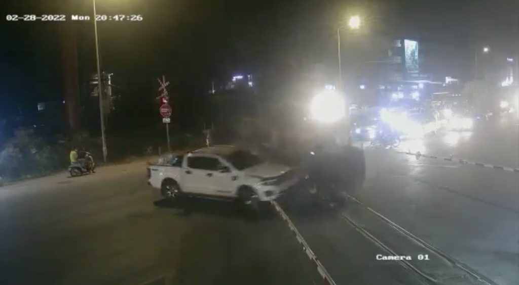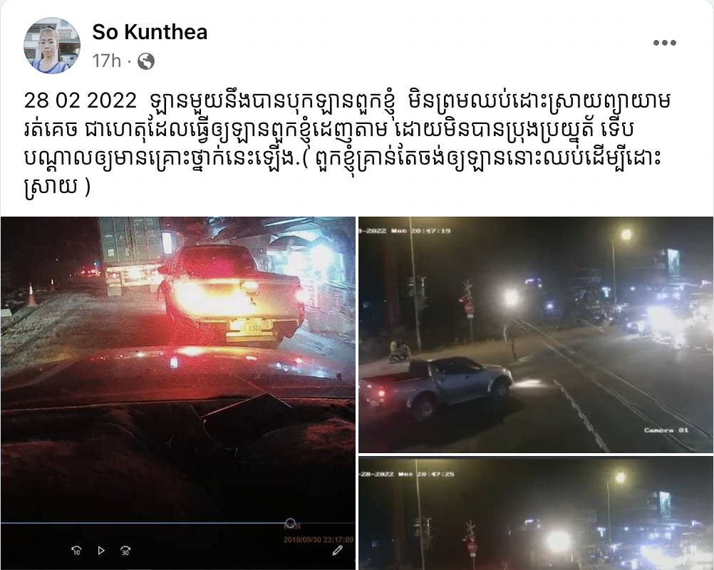 សូមបញ្ជាក់ថា ឡាន Mitsubishi Triton បានបុកឡាន high lander ពីក្រោយ ធ្វើអោយខូចខាត តែមិនបានឈប់ ដើម្បីដោះស្រាយ ហើយព្យាយាមរត់ ទើបធ្វើអោយឡាន Ford ដែលជាសាច់ញាតិតាមពីក្រោយដើម្បីកាក់អោយឈប់ដើម្បីដោះស្រាយ តែដោយសារមិនបានដឹងថា រថភ្លើងធ្វើដំណើរមកជិតដល់តំបន់ឆ្លងកាត់ ទើបធ្វើអោយគាត់ជ្រុលល្បឿន ហើយក៏ត្រូវរថភ្លើងប៉ះត្រូវក្បាលឡាន Ford ដោយសារតែព្យាយាមកាក់ឡាន Mitsubishi Triton ដែលព្យាយាមបើករត់គេចទាំងដឹងថាមានរថភ្លើងឆ្លងកាត់ ប្រថុយនឹងគ្រោះថ្នាក់បើករត់គេចទៅបាត់ស្រមោល»។