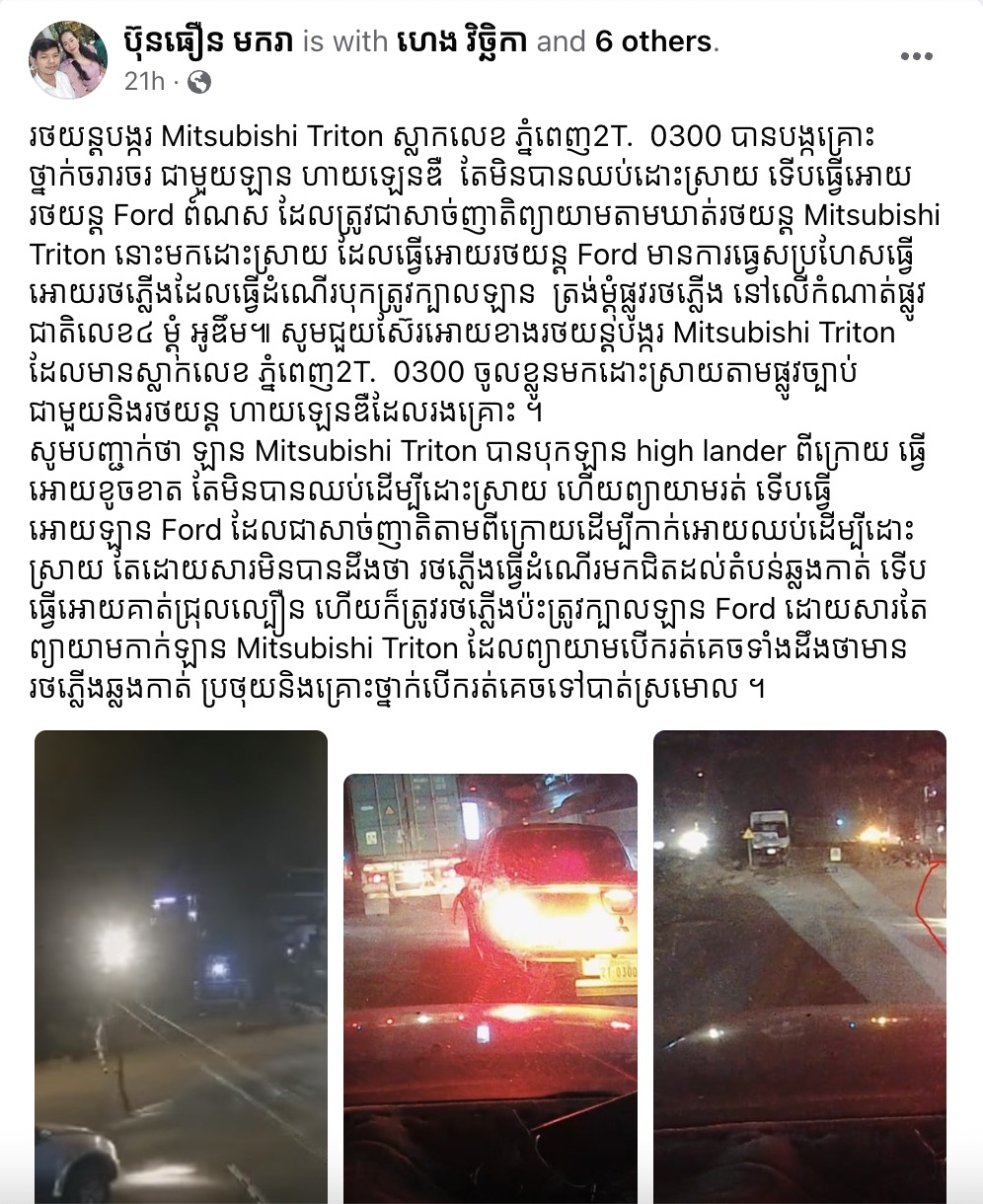 ចំណែកឯភាគីរថយន្ត Ford រងគ្រោះបានបញ្ជាក់នៅលើហ្វេសប៊ុកថា «ឡានមួយនឹងបានបុកឡានពួកខ្ញុំ មិនព្រមឈប់ដោះស្រាយព្យាយាមរត់គេច ជាហេតុដែលធ្វើឲ្យឡានពួកខ្ញុំដេញតាម ដោយមិនបានប្រុងប្រយ័ត្ន ទើបបណ្ដាលឲ្យមានគ្រោះថ្នាក់នេះឡើង.( ពួកខ្ញុំគ្រាន់តែចង់ឲ្យឡាននោះឈប់ដើម្បីដោះស្រាយ )»៕ ដោយ៖ ខ្មែរណូត