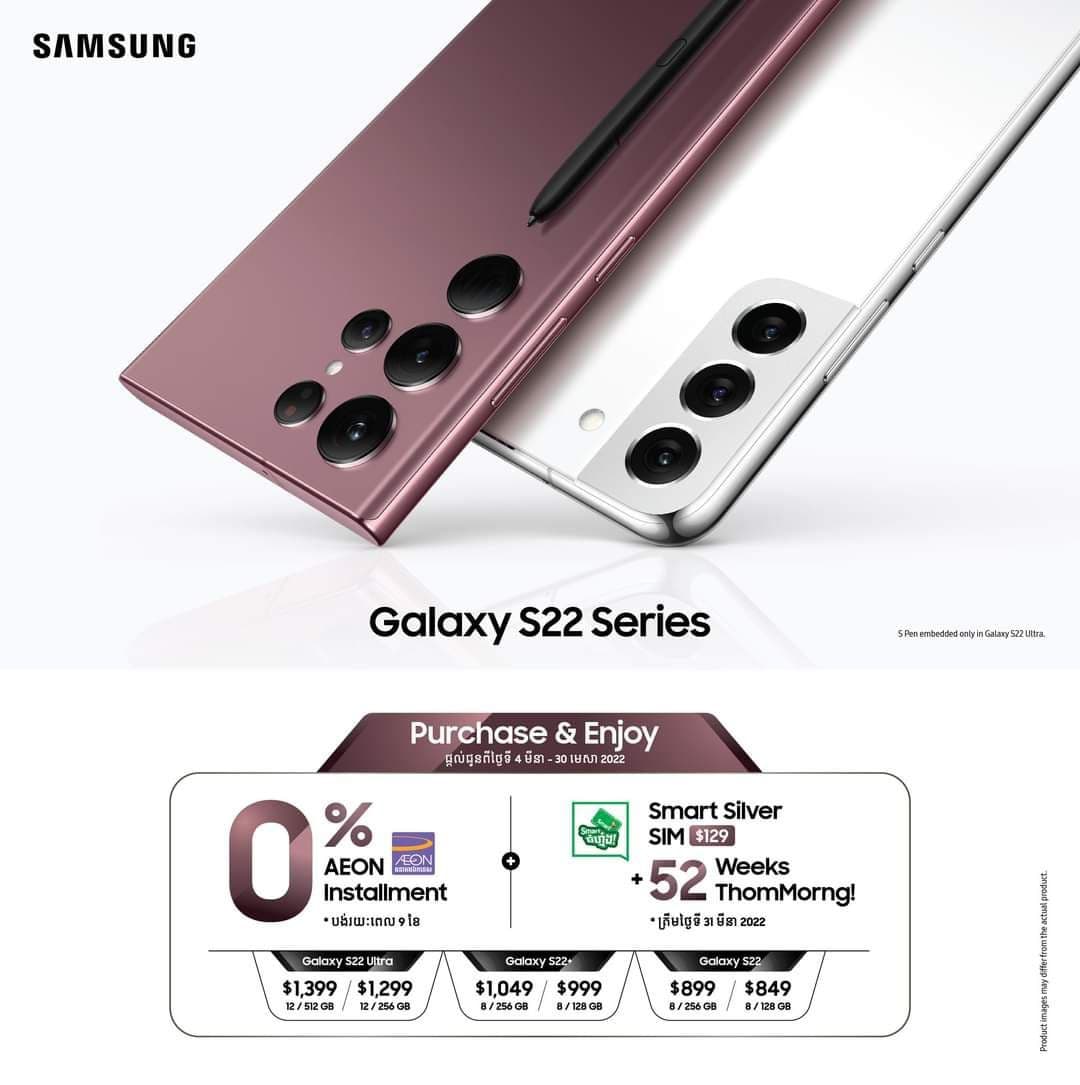 ចាប់ពីថ្ងៃទី 04 ខែមីនា ឆ្នាំ 2022 ដល់ថ្ងៃទី 30 ខែមេសា ឆ្នាំ 2022 អតិថិជន សាមសុង ទាំងអស់ទូទាំងប្រទេសគ្រាន់តែទិញស្មាតហ្វូនដ៏ល្អឯកប្រចាំឆ្នាំ 2022 Galaxy S22 Ultra, Galaxy S22+ ឬ Galaxy S22 នឹងទទួលបានកម្មវិធីប្រូម៉ូសិនពិសេសដូចជា៖