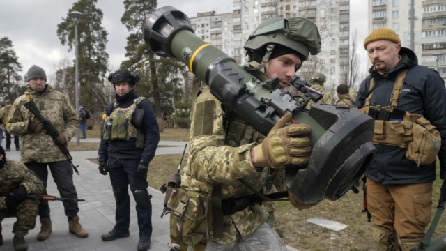 A Ukrainian Territorial Defence Forces member holds an NLAW anti-tank weapon, in the outskirts of Kyiv, Ukraine, Wednesday, March 9, 2022. Authorities announced a new ceasefire on Wednesday to allow civilians to escape from towns around the capital, Kyiv, as well as the southern cities of Mariupol, Enerhodar and Volnovakha, Izyum in the east and Sumy in the northeast. Previous attempts to establish safe evacuation corridors have largely failed due to attacks by Russian forces. (AP Photo/Efrem Lukatsky)