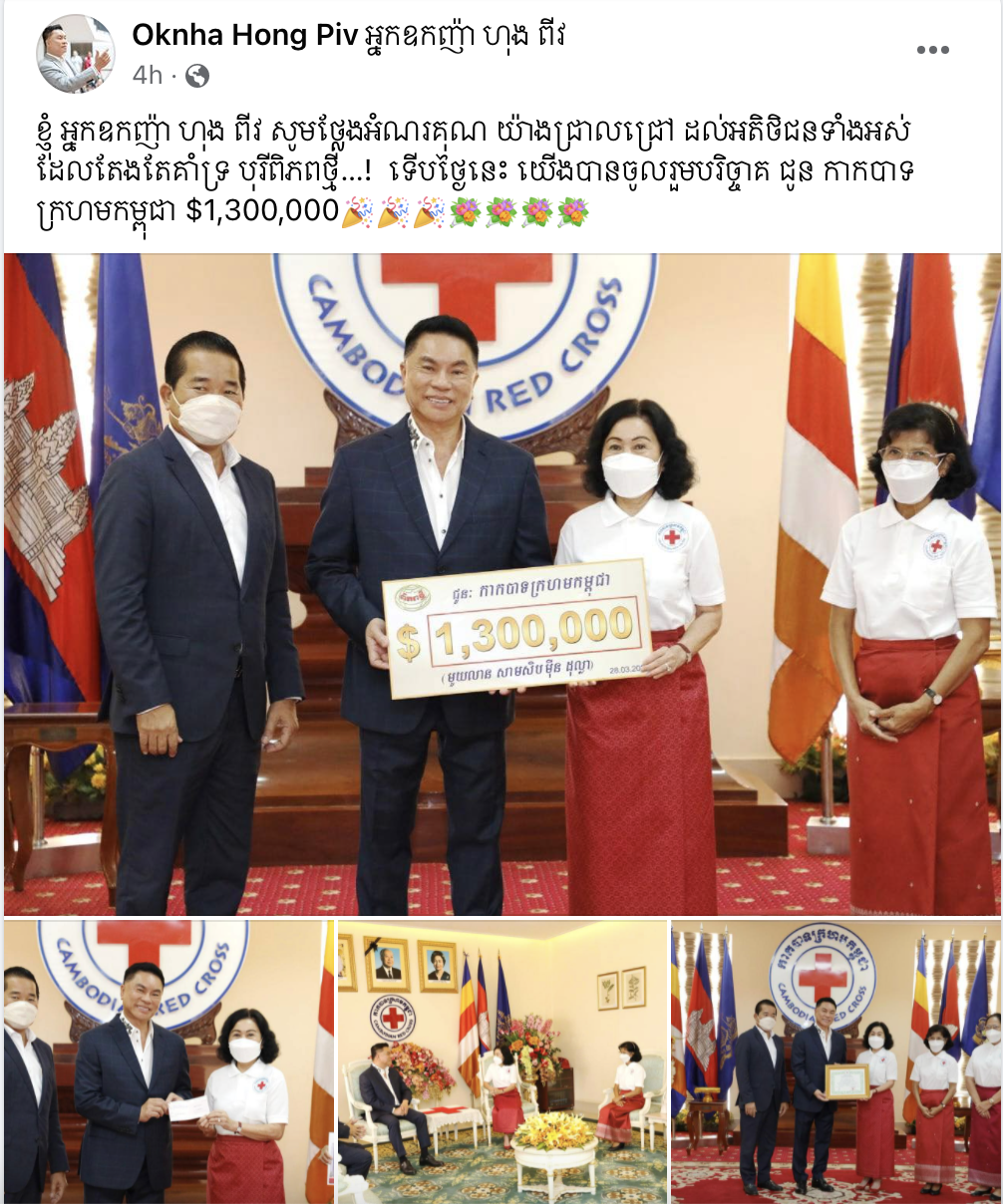 ទំព័រ Facebook ដដែលបានរៀបរាប់អោយដឹងថា៖ ” ខ្ញុំ អ្នកឧកញ៉ា ហុង ពីវ សូមថ្លែងអំណរគុណ យ៉ាងជ្រាលជ្រៅ ដល់អតិថិជនទាំងអស់ ដែលតែងតែគាំទ្រ បុរីពិភពថ្មី…! ទេីបថ្ងៃនេះ យេីងបានចូលរួមបរិច្ចាគ ជូន កាកបាទក្រហមកម្ពុជា $1,300,000🎉🎉🎉💐💐💐💐”។