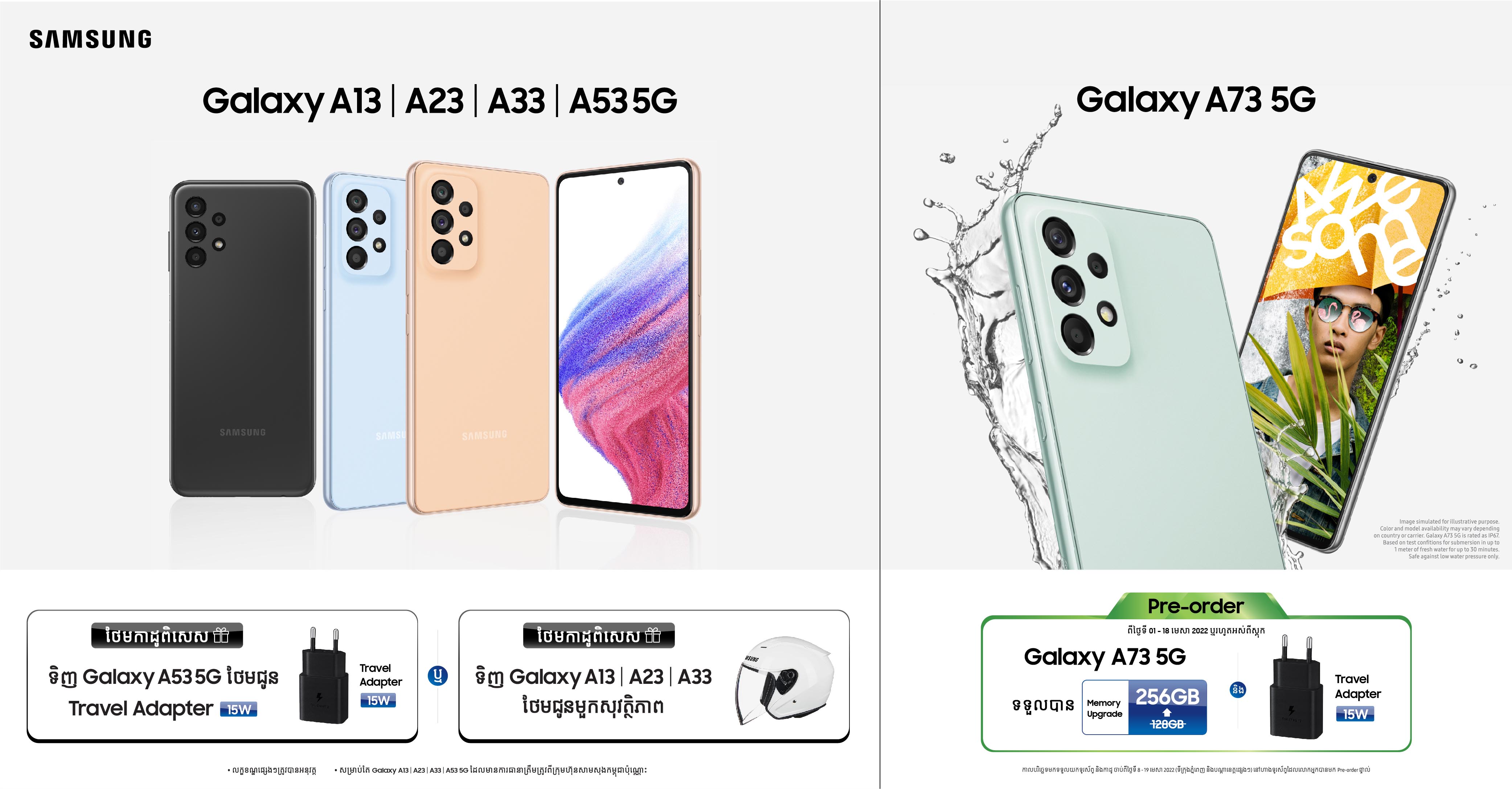 (ភ្នំពេញ) ថ្ងៃទី ០១ ខែមេសា ឆ្នាំ២០២២៖ មានទាំងចេញលក់ផ្លូវការផង…មានទាំងកម្ម៉ង់ទុកមុនផង…មានទាំងប្រូម៉ូសិនថែមជូនម៉ា Awesome ផង…! មួយរយៈចុងក្រោយនេះឃើញថា Galaxy A សេរី ចុងក្រោយឆ្នាំ 2022 ដែលក្រុមហ៊ុន សាមសុង បញ្ចេញលក់លើទីផ្សារក្នុងប្រទេសកម្ពុជាយើងឃើញថាទទួលបានការពេញចិត្តច្រើនខ្លាំងណាស់ពីសំណាក់អ្នកប្រើប្រាស់ស្មាតហ្វូនគ្រប់ស្រទាប់វណ្ណៈតែម្តង!