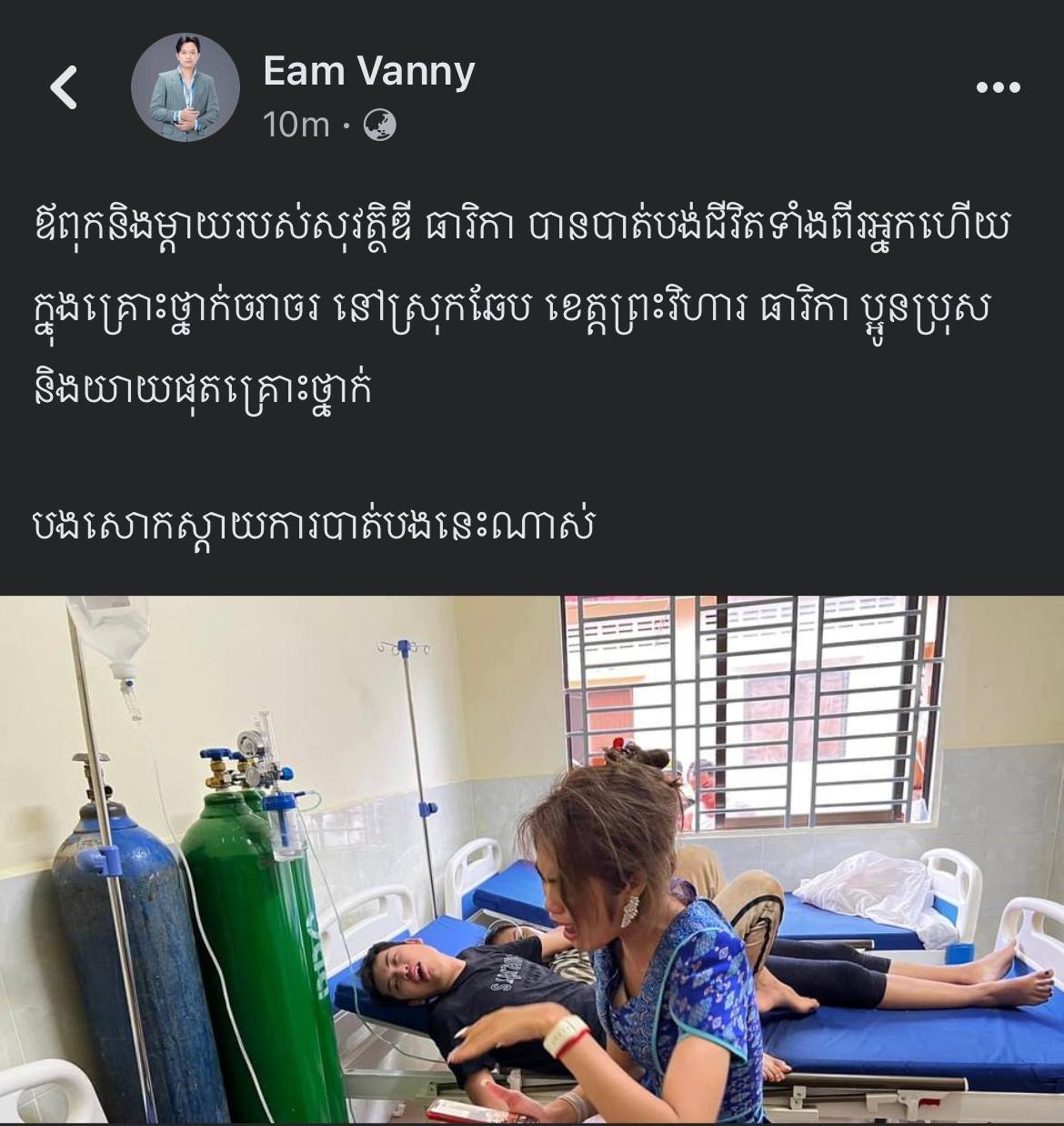 គ្រោះថ្នាក់ចរាចរណ៍នេះដែរបានកើតឡើងនៅ ស្រុកឆែប ខេត្តព្រះវិហារ ខណៈដែលនាងត្រឡប់មកពីកម្មវិធីសម្ភោធដាក់អោយប្រើប្រាស់ជាផ្លូវការវេទទិកាអុំទូក និងសំណង់សិល្បការផ្សេងៗ ស្ថិតក្នុងភូមិកំពង់ស្រឡៅ ឃុំកំពង់ស្រឡៅមួយ ស្រុកឆែប ខេត្តព្រះវិហារ៕ ផ្តល់សិទ្ធិដោយ៖ ខ្មែរណូត