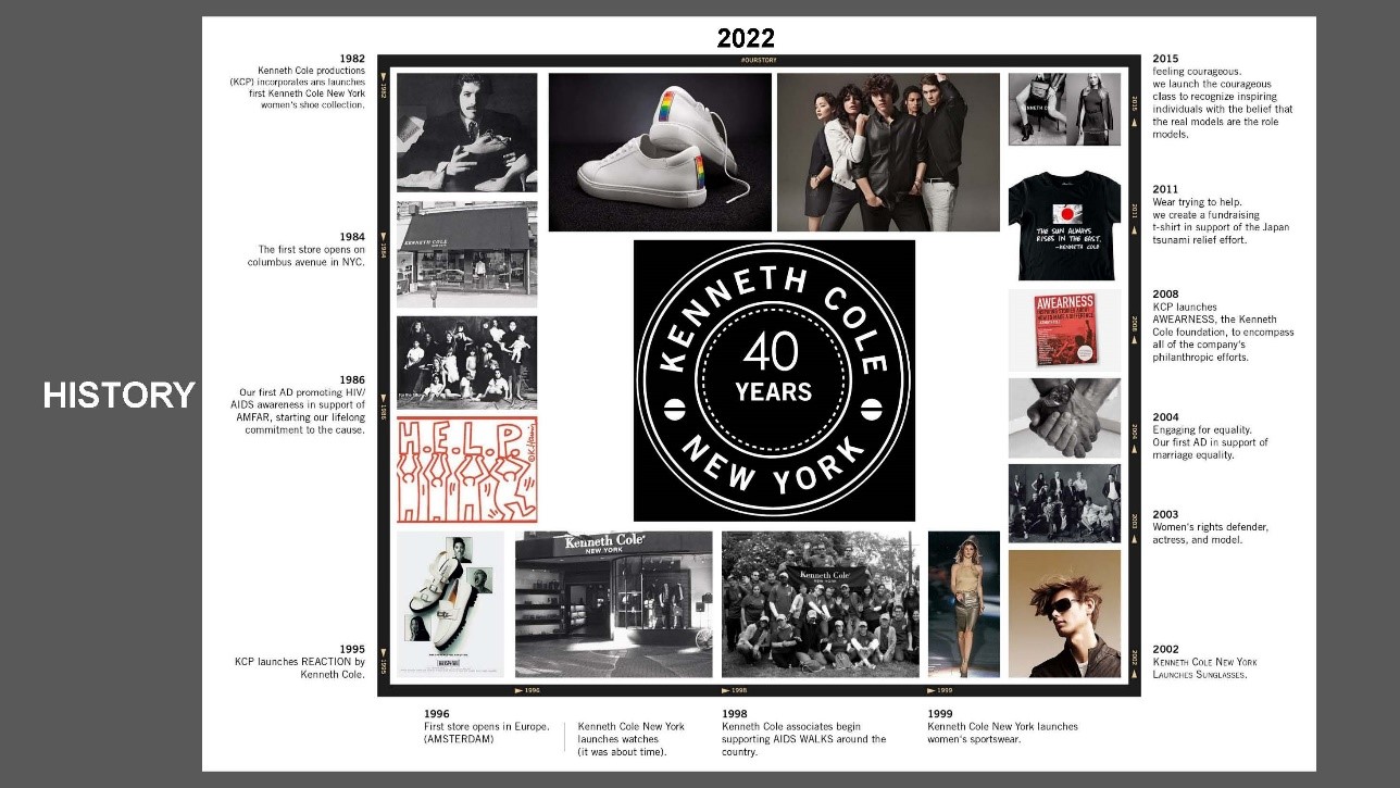 ក្រុមហ៊ុន KENNETH COLE បានបង្កើតឡើងក្នុងឆ្នាំ 1982 នៅទីក្រុង New York សហរដ្ឋអាមេរិក ។ ផលិតផលដំបូងរបស់ KENNETH COLE គឺជាស្បែកជើងរបស់នារី ដែលទទួលបានជោគជ័យខ្លាំងបំផុត ដោយលក់បានរហូតដល់ជាង 40,000 គូ ក្នុងរយៈពេលត្រឹមតែ ៣ថ្ងៃកន្លះ ប៉ុណ្ណោះ ។