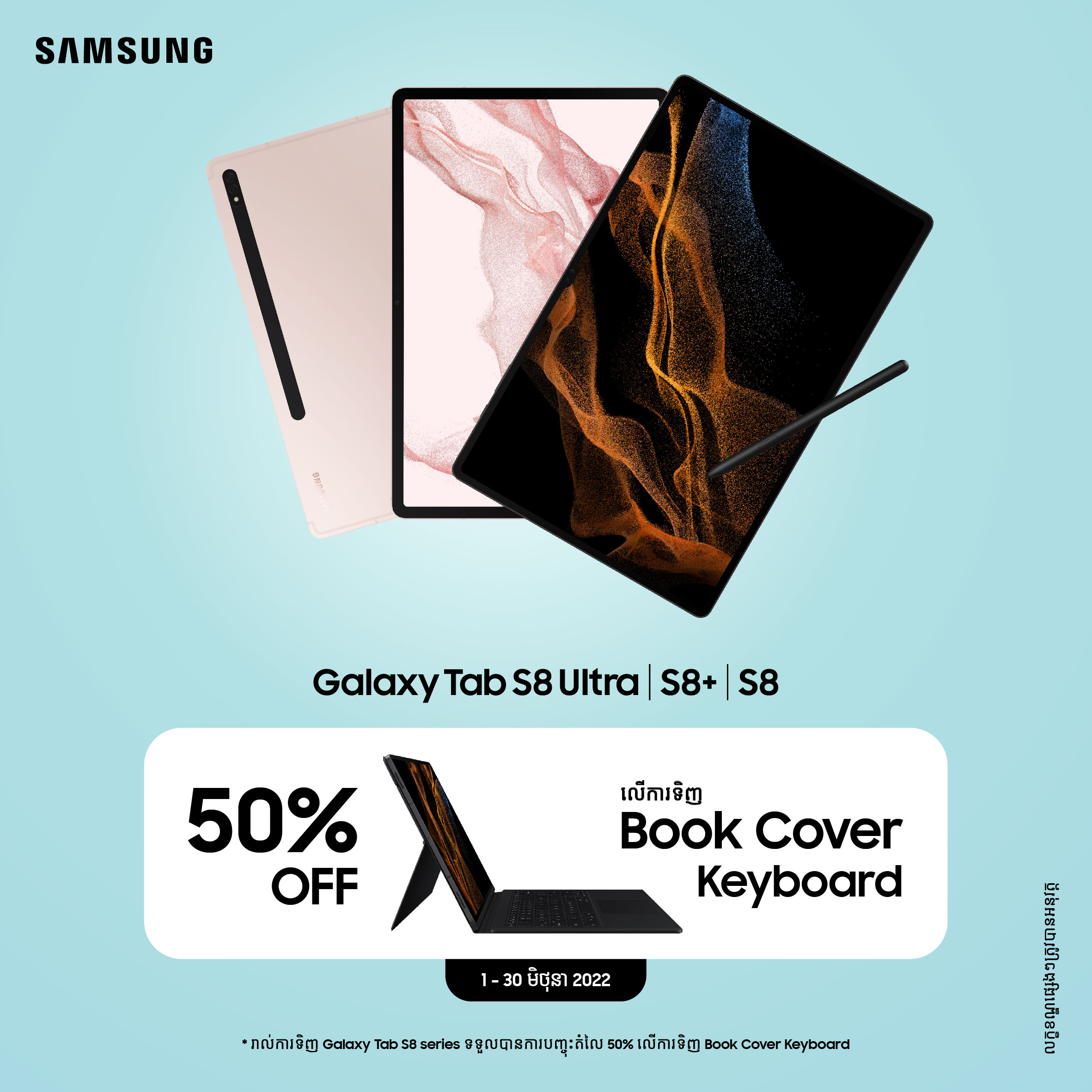 (ភ្នំពេញ) ថ្ងៃទី 31 ខែឧសភា ឆ្នាំ ២០២២៖ ដើម្បីជំរុញដល់ផលិតភាពការងារដ៏ឆ្លាតវៃ…ការកម្សាន្តឥតដែនកំណត់ និងដើម្បីឆ្លើយតបតាមតម្រូវការដ៏ច្រើនលើសលុប…រាល់ការទិញថេប្លេត Galaxy Tab S8, Galaxy Tab S8+ និង Galaxy Tab S8 Ultra ចាប់ពីថ្ងៃទី 01 ដល់ 30 ខែមិថុនា ឆ្នាំ 2022 នៅតាមបណ្តាហាងចែកចាយផលិតផល សាមសុង ផ្លូវការទូទាំងប្រទេស អតិថិជនទាំងអស់នឹងទទួលបានការបញ្ចុះតម្លៃពិសេស 50% ទៅលើ Keyboard Cover ភ្លាមៗ! កំពូលថេប្លេតទាំង 3 ស៊េរី នេះ គឺពិតជាថេប្លេតដែលល្អបំផុតប្រចាំឆ្នាំ 2022 ដែលជួយបង្កើននូវគំនិតច្នៃប្រឌិត និងផលិតភាពការងារ របស់អ្នកឱ្យកាន់តែលេចធ្លោអស្ចារ្យបំផុត! បើនិយាយពីការកម្សាន្តវិញគឺពិតជាផ្តល់នូវអារម្មណ៍រំភើបរីករាយហួសពីការស្មាន និងឥតដែនកំណត់!