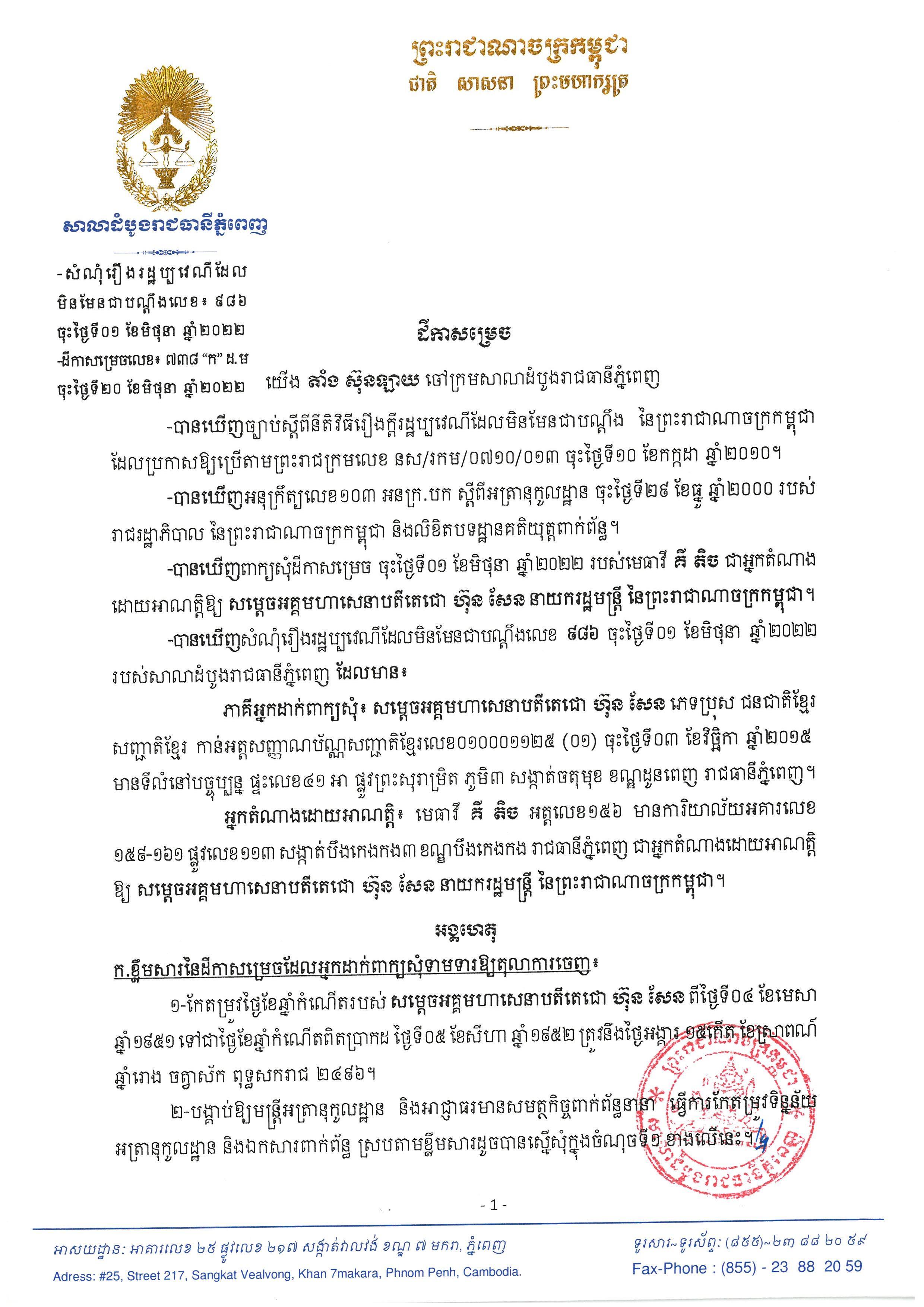 តាមរយៈដីកាសម្រេចរបស់ខ្លួន សាលាដំបូងរាជធានីភ្នំពេញ ក៏បានបង្គាប់ឲ្យមន្ដ្រីអត្រានុកូលដ្ឋាន និងអាជ្ញាធរមានសមត្ថកិច្ចពាក់ព័ន្ធនានា ធ្វើការកែតម្រូវទិន្នន័យអត្រានុកូលដ្ឋាន និងឯកសារពាក់ព័ន្ធស្របតាមខ្លឹមសារ ដូចដែលបានបញ្ជាក់នៅចំណុចខាងលើ។