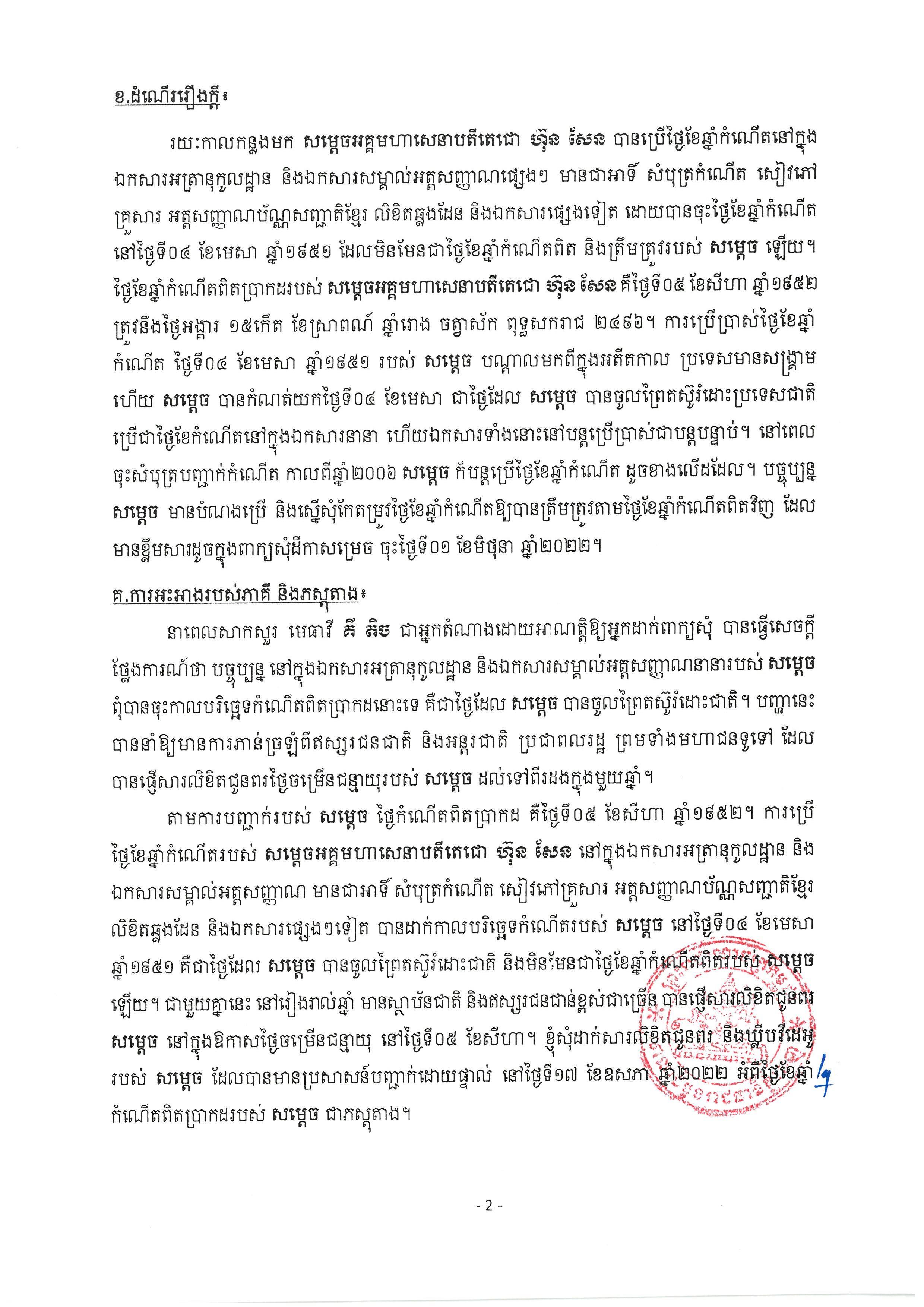 សូមរំលឹកថា លោក គី តិច មេធាវីតំណាងដោយអាណត្តិរបស់សម្តេចតេជោ ហ៊ុន សែន នាយករដ្ឋមន្ត្រីនៃកម្ពុជា នៅថ្ងៃទី០១ ខែមិថុនា ឆ្នាំ២០២២កន្លងទៅ បានដាក់ពាក្យសុំឲ្យប្រធានសាលាដំបូងរាជធានីភ្នំពេញ ចេញដីកាសម្រេចកែតម្រូវថ្ងៃខែឆ្នាំកំណើតសម្តេចតេជោ មកថ្ងៃខែឆ្នាំពិតប្រាដកវិញ គឺថ្ងៃទី៥ ខែសីហា ឆ្នាំ១៩៥២។