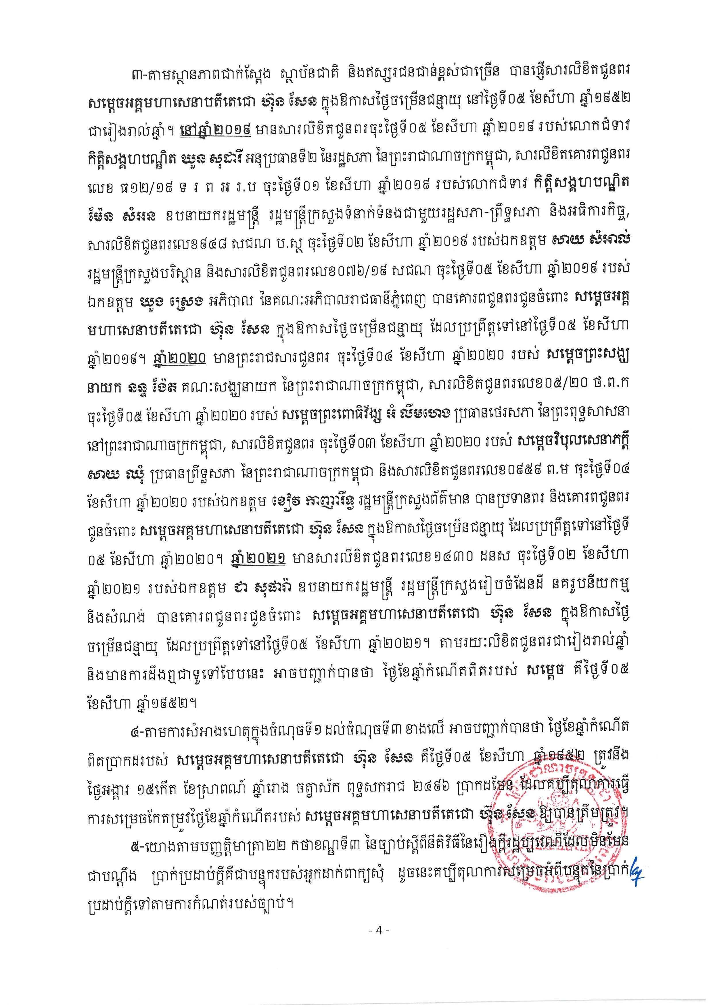 លោកបញ្ជាក់បន្ថែមទៀតថា នៅក្នុងសម័យកាលសង្គ្រាម និងរបបប្រល័យពូជសាសន៍ អំឡុងពេលចាប់ពីឆ្នាំ១៩៧៥ ដល់ឆ្នាំ១៩៧៩ រាល់ឯកសារពាក់ព័ន្ធត្រូវបានរងការបំផ្លិចបំផ្លាញបាត់បង់ស្ទើរគ្មានសេសសល់។ នៅក្រោយថ្ងៃរំដោះ ៧មករា ឆ្នាំ១៩៧៩ ដោយសារការបាត់បង់ឯកសារពាក់ព័ន្ធនានាទាំងអស់ ទើបធ្វើឱ្យការកំណត់ព័ត៌មានអត្តសញ្ញាណរបស់ប្រជាពលរដ្ឋជាច្រើនលើសលប់ ដែលក្នុងនោះរួមទាំង សម្ដេចតេជោផងដែរ គឺពុំមានការចងចាំ ប្រាកដប្រជា អំពីថ្ងៃ-ខែ-ឆ្នាំកំណើតបានឡើយ។ ដូច្នេះលោកមេធាវី គោរពស្នើសុំលោកប្រធានសាលាដំបូងរាជធានីភ្នំពេញ ចេញដីកាសម្រេចកែតម្រូវថ្ងៃខែឆ្នាំកំណើតសម្តេចតេជោ មកថ្ងៃខែឆ្នាំពិតប្រាដក គឺថ្ងៃទី៥ ខែសីហា ឆ្នាំ១៩៥២វិញ៕ ផ្តល់សិទ្ធិដោយ៖ freshnews